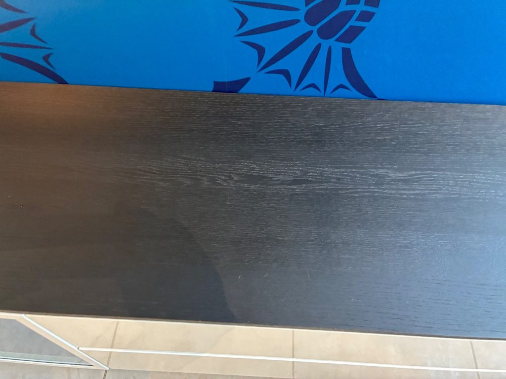 Lack Bianco Weiß Hochglanz, Inkl. Beleuchtung und Abdeckboden in Raucheiche Anthrazit ca.: BHT 182,60 54,60 42,40 cm, Vitrine 1 Tür mit Glasausschnitt links angeschlagen