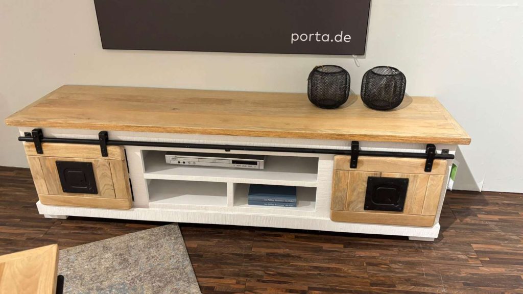 B/H/T ca. 180x50x45 cm Korpus Mango massiv sägerau, weiß lackiert Front/ Platte Mango massiv geb. lack. Inneneinteilung MDF weiß lackiert Metallapplikationen schwarz lackiert sichtbare Rückwand MDF weiß lackiert 2 Schiebetüren links/ rechts je 1x Konstruktionsboden mittig: 1 große Ablage, 2 kleine Ablagen, Kabeldurchführung