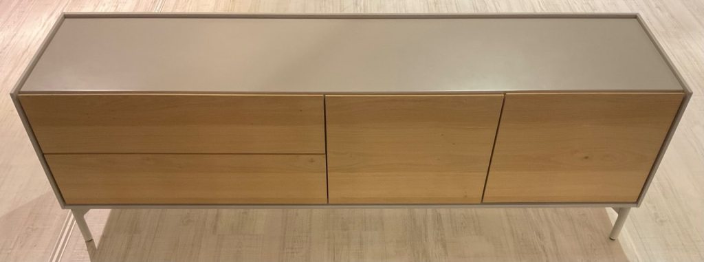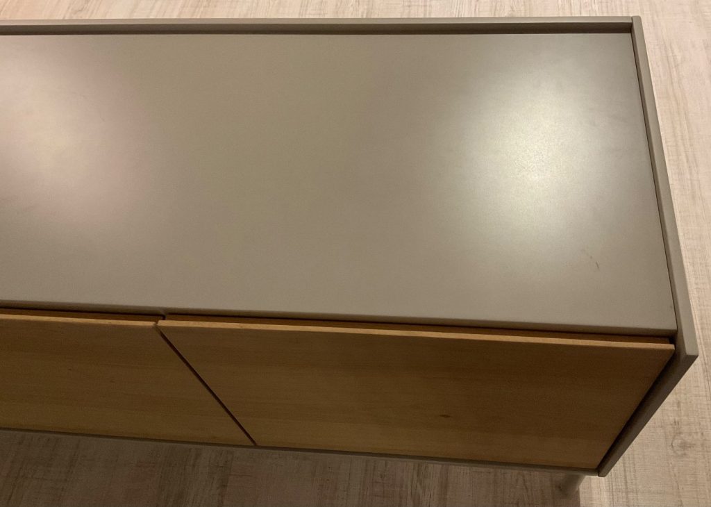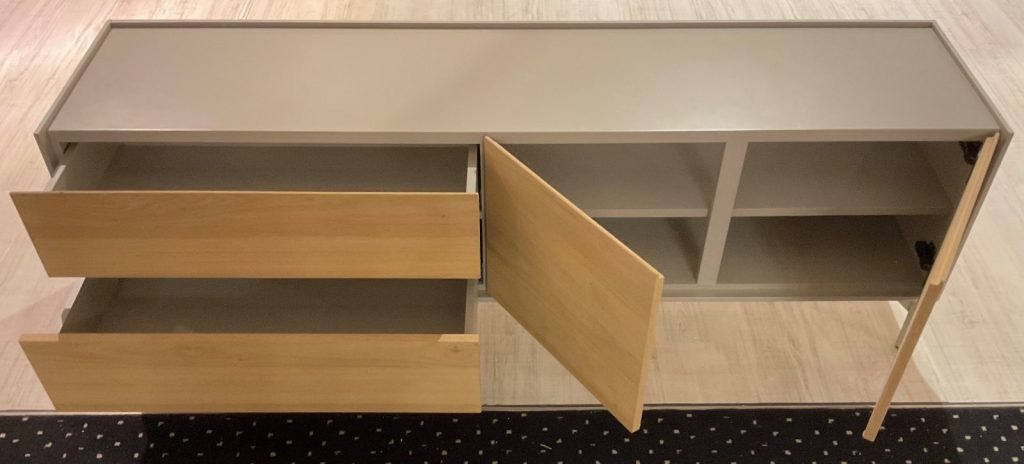 Eiche natur furniert, grau lackiert, 2 Türen, 2 Schubladen, ca. 170 x 55 x 42 cm