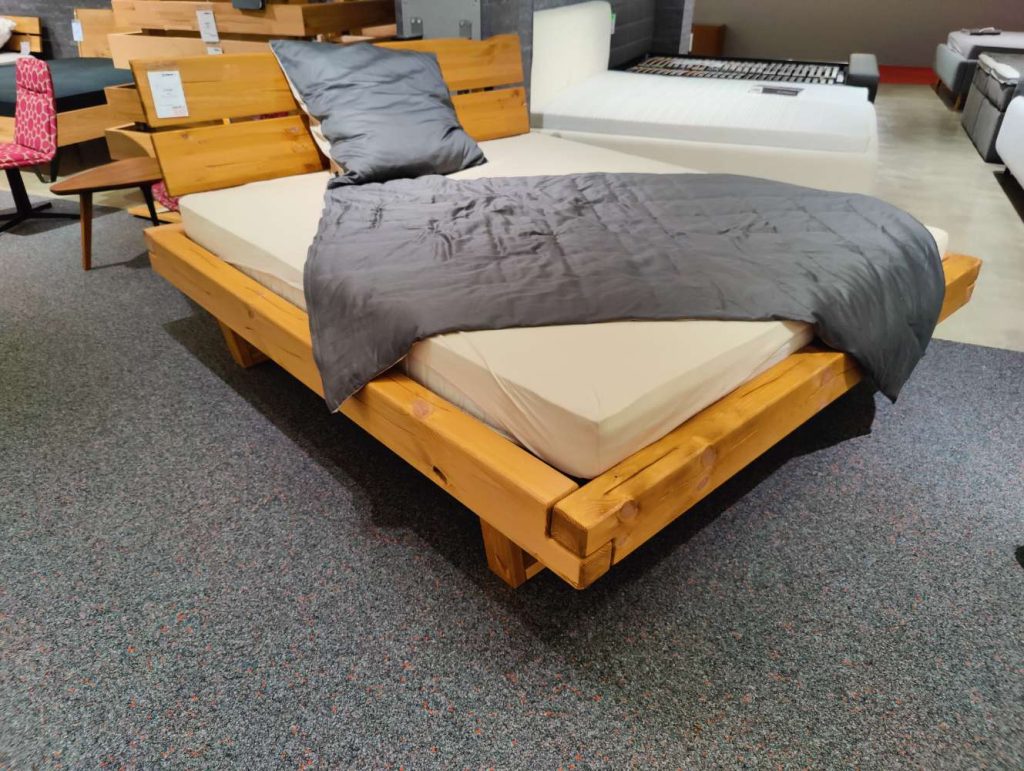Die großzügige Liegefläche von 180 x 200 cm bietet ausreichend Platz für erholsame Nächte zu zweit. Das Bett wird als Ausstellungsware angeboten, was seine Qualität und den exzellenten Zustand unterstreicht. Das Design wird durch stilvolle Holzkufen ergänzt, die dem Bett einen modernen und dennoch robusten Charakter verleihen. Beachten Sie, dass weder Lattenrost noch Matratzen im Lieferumfang enthalten sind, was Ihnen die Freiheit gibt, diese Komponenten nach Ihren individuellen Wünschen auszuwählen. Dieses Bett ist mehr als nur ein Ort zum Schlafen; es ist ein Statement der Eleganz und Handwerkskunst, das jeden Raum bereichert.