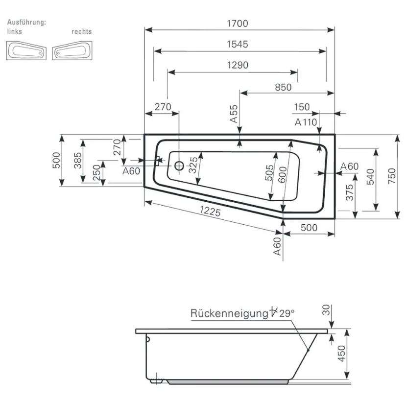 Mauersberger Acryl Raumsparbadewanne Globosa 170/75 rechts NEU