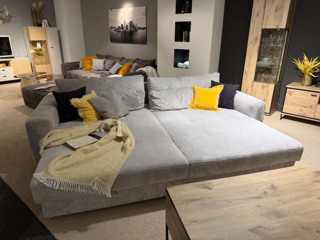 Megasofa Cord grau, ca. 292×194 cm.