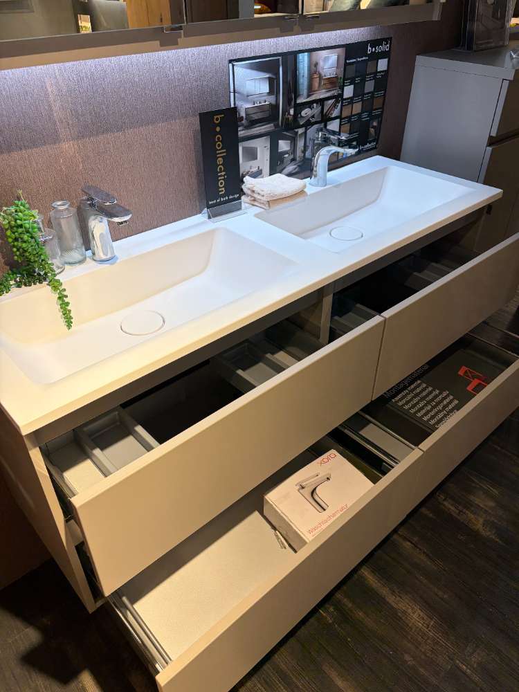 BemerkungDas B-SOLID Komplettbad in stilvollem Steingrau vereint Funktionalität und Ästhetik auf eindrucksvolle Weise. Der Korpus aus Dekor bietet eine robuste und dennoch elegante Basis, während das Waschbecken aus Solid Surface mit seiner matten Oberfläche für Langlebigkeit und leichte Pflege sorgt. Mit einer großzügigen Breite von ca. 141,2 cm bietet der Doppelwaschtisch ausreichend Platz für den täglichen Gebrauch und ist gleichzeitig ein echter Blickfang.