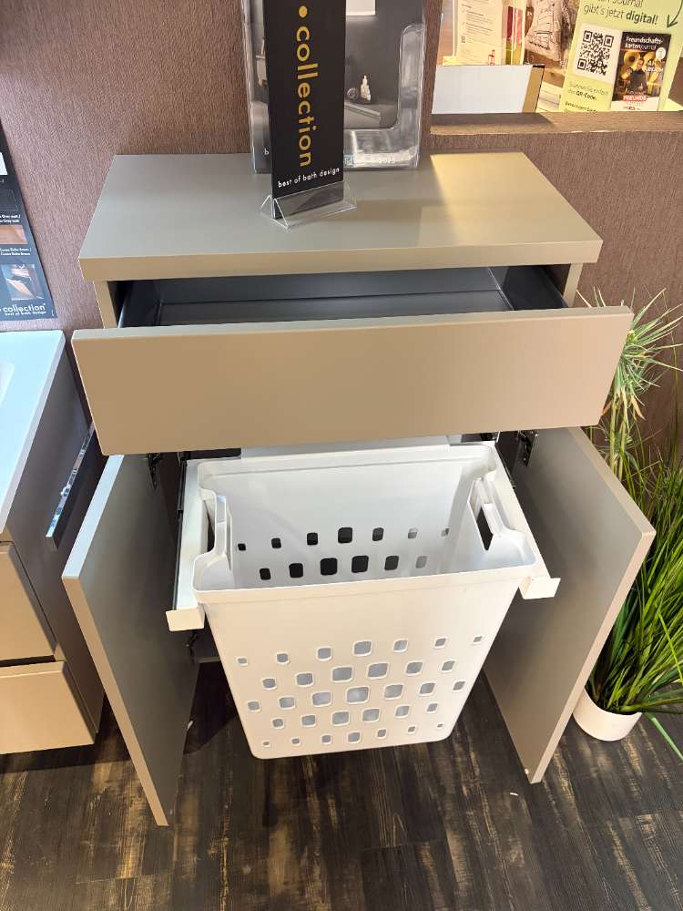 Die durchdachte Ausstattung umfasst Softclose-Technologie für sanftes und leises Schließen, sowie eine dimmbare Waschplatzbeleuchtung, die je nach Bedarf angepasst werden kann. Der doppelt verspiegelte Spiegelschrank unterstreicht den modernen Look und bietet zusätzlichen Stauraum für Ihre Badezimmerutensilien. Im Midischrank, der kompakte Maße von ca. 60/83/33 cm aufweist, sorgt ein integrierter Wäschekorb für noch mehr Ordnung.
