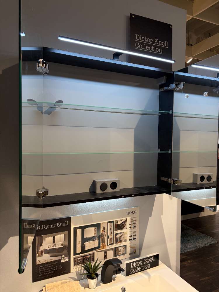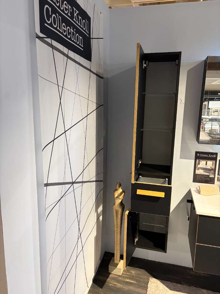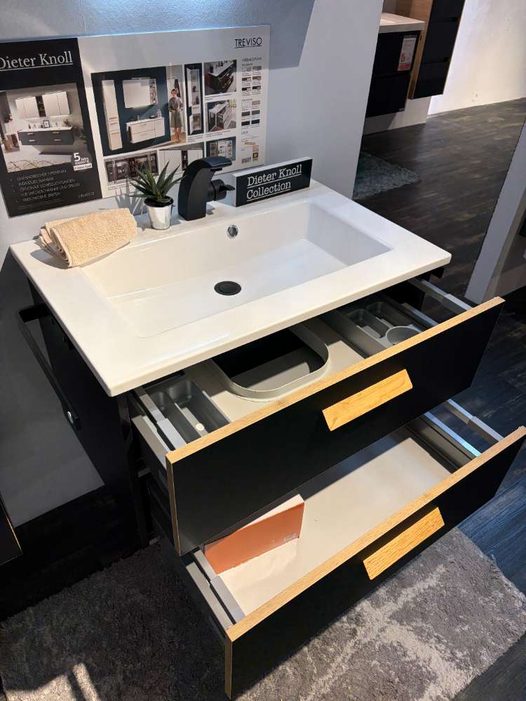 Das Mineralmarmor-Waschbecken fügt einen Hauch von Luxus hinzu, ergänzt durch ein doppelt verspiegeltes Design des Spiegelschranks und stilvolle Aufsatzleuchten. Die integrierte Waschplatzbeleuchtung sorgt für eine angenehme Atmosphäre. Praktische Extras wie Softclose-Schubladen, Handtuchhalter und die schwarze Armatur perfektionieren das Angebot. Die durchdachte Schubkasteneinteilung hilft dabei, Ordnung zu halten und alle Badutensilien übersichtlich zu verstauen. Mit dieser Ausstellungsware wird Ihr Badezimmer zu einem stilvollen Wohlfühlbereich.