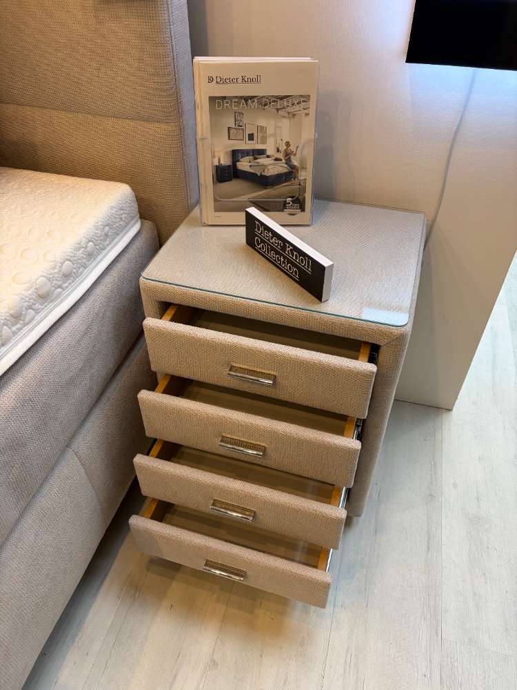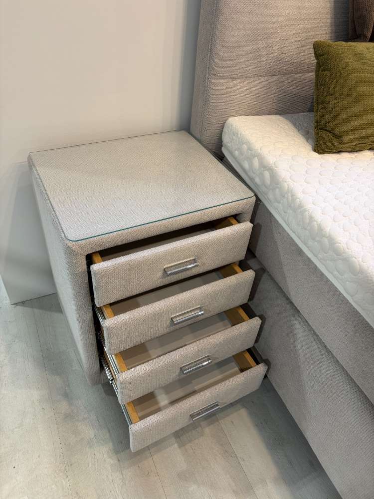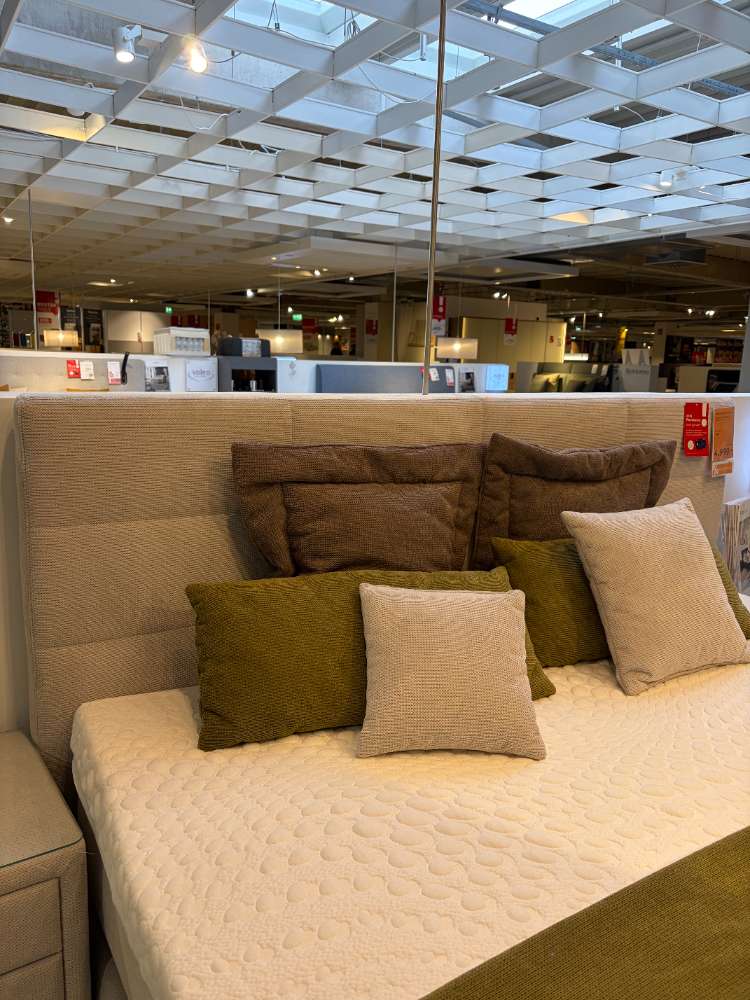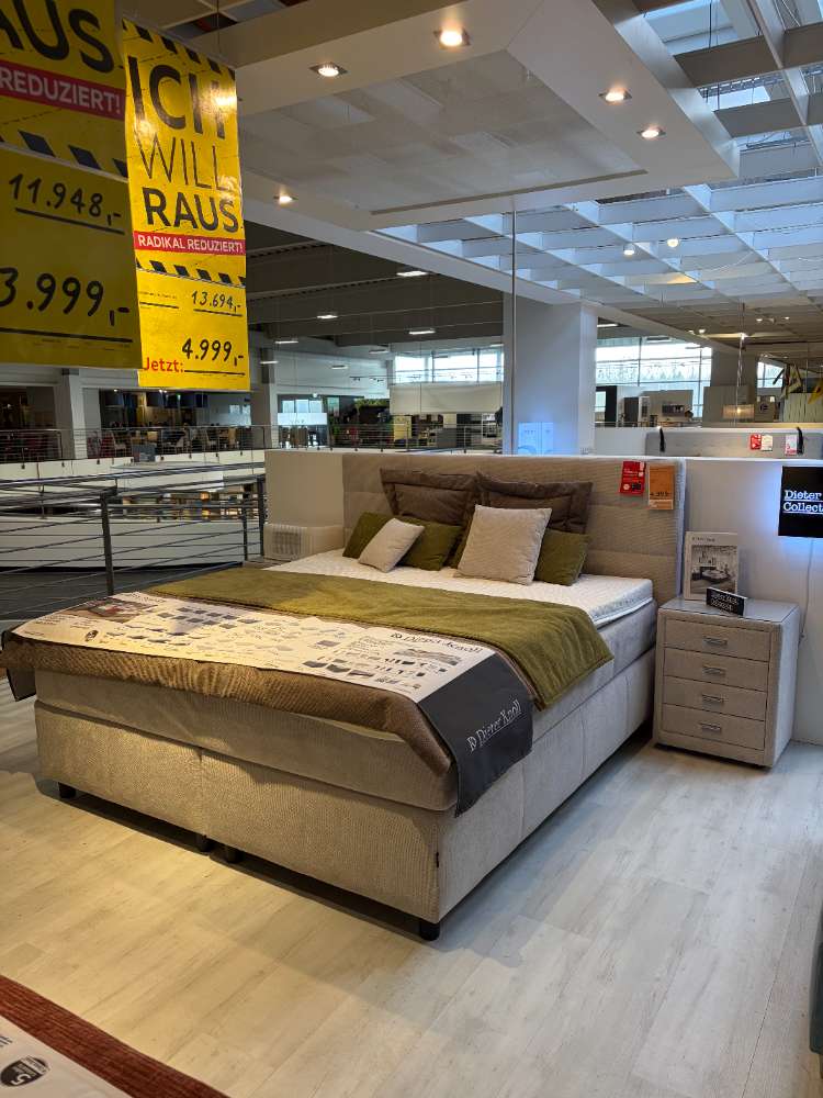 Besonders praktisch sind die zwei Nachtschränke auf Rollen, die mit jeweils vier geräumigen Auszügen und einer edlen Glasplatte ausgestattet sind. Diese bieten nicht nur zusätzlichen Stauraum, sondern lassen sich auch mühelos im Raum bewegen. Ein weiterer Pluspunkt ist der inklusive Gel-Topper, der das Schlaferlebnis perfekt abrundet. Für eine harmonische Dekoration sorgen die beiden Tagesdecken in Grün und Braun sowie die sechs passenden Kissen, die das Bett in eine gemütliche Wohlfühloase verwandeln. Als Ausstellungsware vereint dieses Bett höchsten Komfort mit moderner Funktionalität und stilvoller Eleganz.