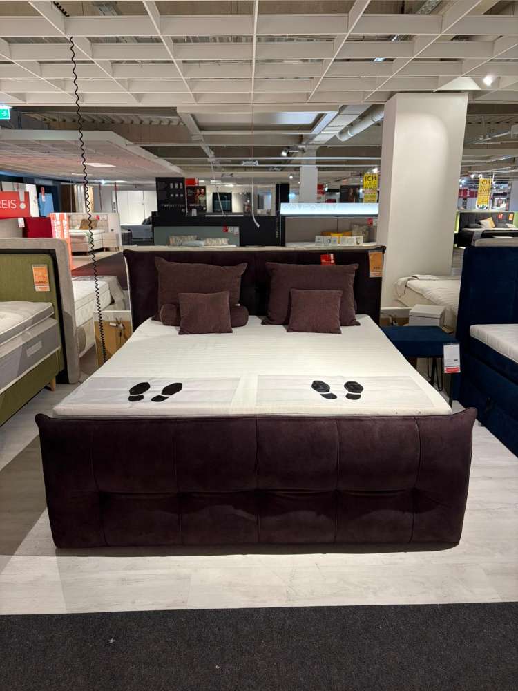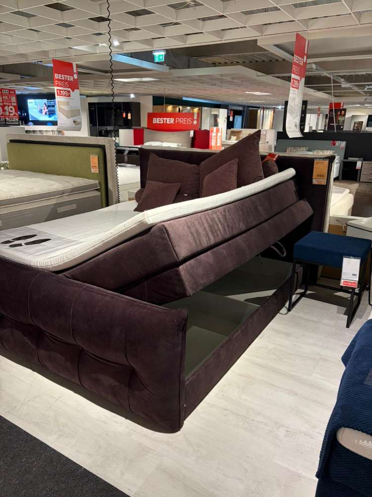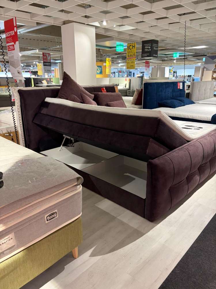 BemerkungDas Boxspringbett MARACANA 6 in faszinierendem Aubergine vereint stilvolles Design mit funktionaler Eleganz. Die Ausstellungsware strahlt dank des hochwertigen Velourstoffs eine luxuriöse Anmutung aus und fügt sich nahtlos in Ihre Wohnräume ein. Mit einer großzügigen Liegefläche von 180 x 200 cm bietet es viel Platz für erholsame Nächte. Besondere Highlights dieses Modells sind der seitlich zu öffnende Bettkasten, der zusätzlichen Stauraum für Bettwäsche und persönliche Gegenstände schafft, und die Wendematratzen mit den Härtegraden 3 und 4, die individuell an Ihre Schlafbedürfnisse angepasst werden können. Der inklusive Kaltschaumtopper sorgt für zusätzlichen Komfort und unterstützt optimal den Körper. Abgerundet wird das Ensemble durch ein luxuriöses Kissenset aus sechs Kissen, das nicht nur einen stilvollen Akzent setzt, sondern auch extra Gemütlichkeit bietet. Das MARACANA 6 verkörpert Schlafkomfort auf höchstem Niveau und verwandelt jedes Schlafzimmer in eine Oase der Ruhe.