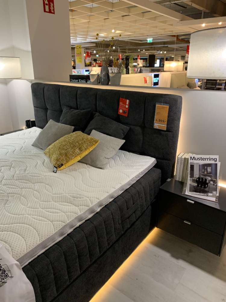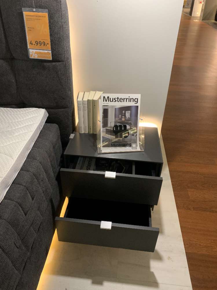 BemerkungVerkauft wird ein wunderschönes Musterring Boxspringbett Felina-Fly in edlem Anthrazit. Es handelt sich um ein Ausstellungsstück und befindet sich daher in einem fast neuwertigen Zustand. Das Bett überzeugt durch sein modernes Design, hohen Komfort und die gewohnt hervorragende Musterring-Qualität. Die großzügige Liegefläche von 180x200 cm bietet viel Platz für erholsame Nächte. Die Matratze mit Härtegrad 2 sorgt in Kombination mit dem hochwertigen Viscotopper für ein angenehm weiches und druckentlastendes Liegegefühl. Zum Bett gehören zwei passende Nachtschränke, ebenfalls in Anthrazit, die wie das Bett mit einer stilvollen indirekten LED-Beleuchtung ausgestattet sind. Dieses exklusive Set vereint Stil, Komfort und Qualität auf höchstem Niveau und verwandelt jedes Schlafzimmer in eine Wohlfühloase.