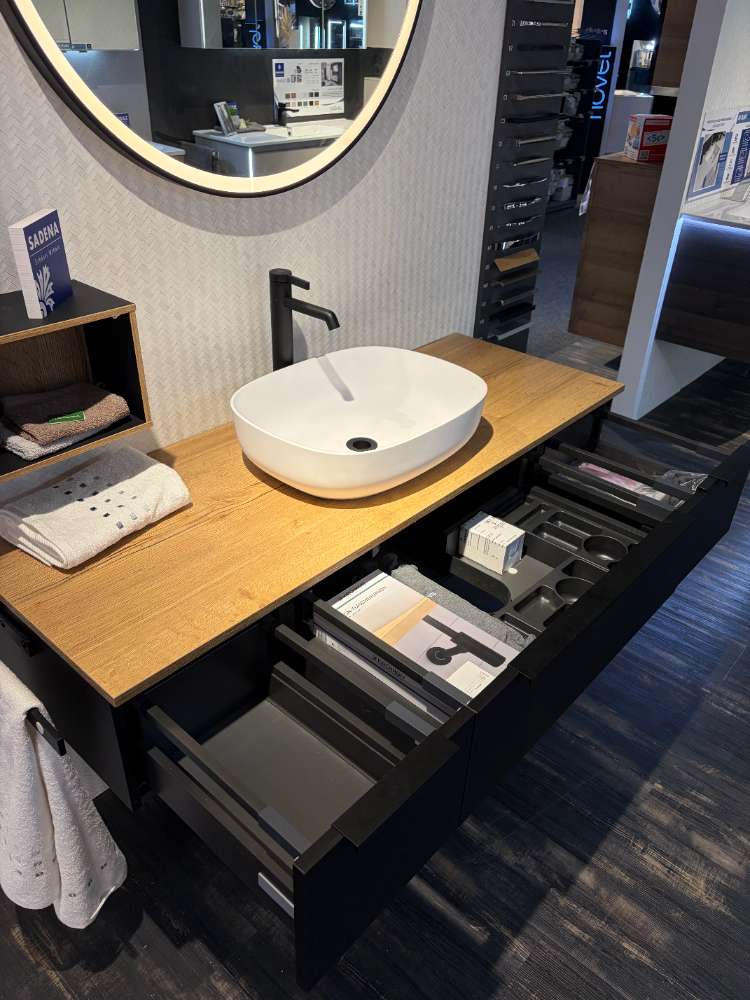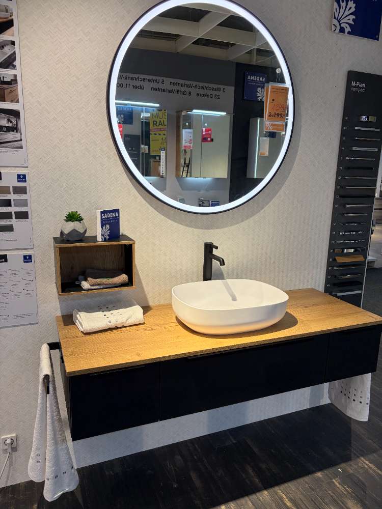 Ergänzt wird das Ensemble durch einen runden Spiegel mit einem Durchmesser von etwa 90 cm, der dank Touchdimmer mühelos an Lichtverhältnisse angepasst werden kann und so stets die perfekte Beleuchtung bietet. Die dazugehörige Wasserwerk Amatur in Schwarz unterstreicht das moderne Design. Praktische Features wie Schubkästen mit Vollauszug und Softclose, ein passendes Regal sowie ein Kosmetik-Einsatz sorgen für Ordnung und Komfort. Zwei schwarze Handtuchhalter runden das Ensemble ab und bieten Funktionalität auf hohem Niveau.