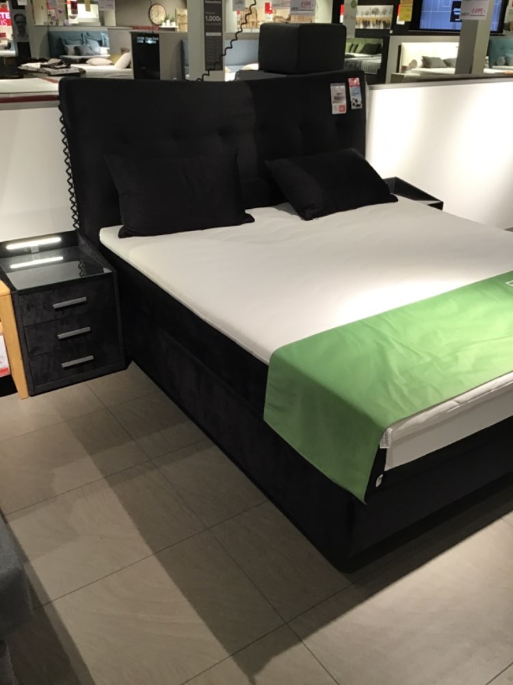 BemerkungDas Boxspringbett mit der Liegefläche 180 x 200 cm (B/H/T: ca. 185 x 126 x 216 cm) in samtig weicher Mikrovelours-Oberfläche ist mit einer wendbaren 7-Zonen-Tonnentaschenfederkern-Matratze in den Härtegraden "fest" (empfohlen ab 80 kg Körpergewicht) und "sehr fest" (empfohlen ab 100 kg) ausgestattet.