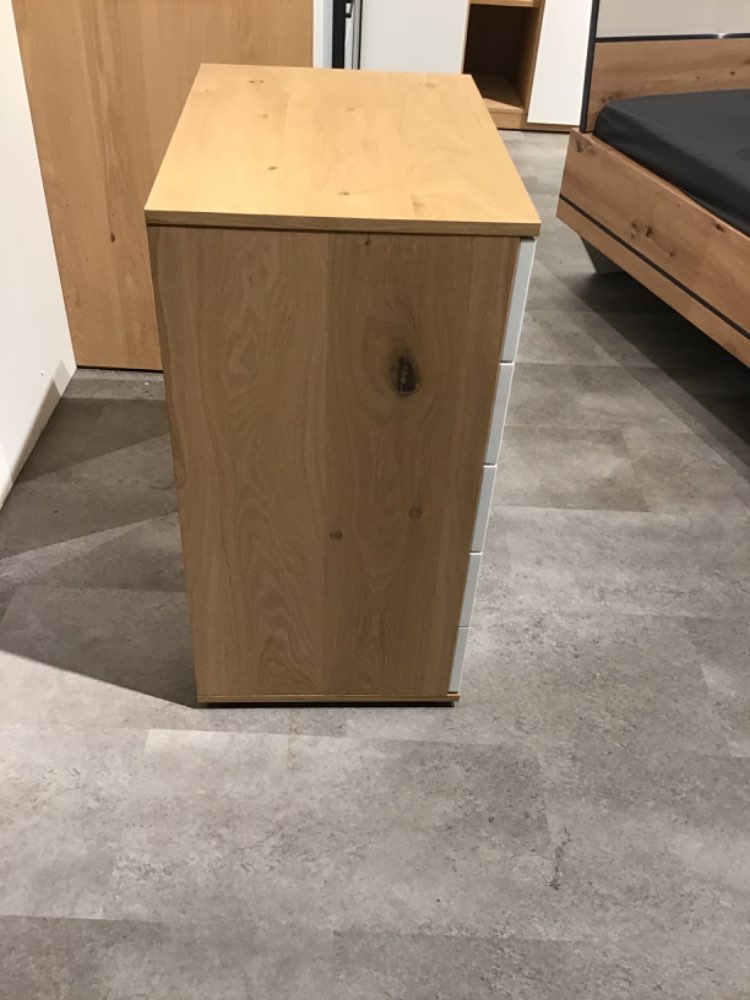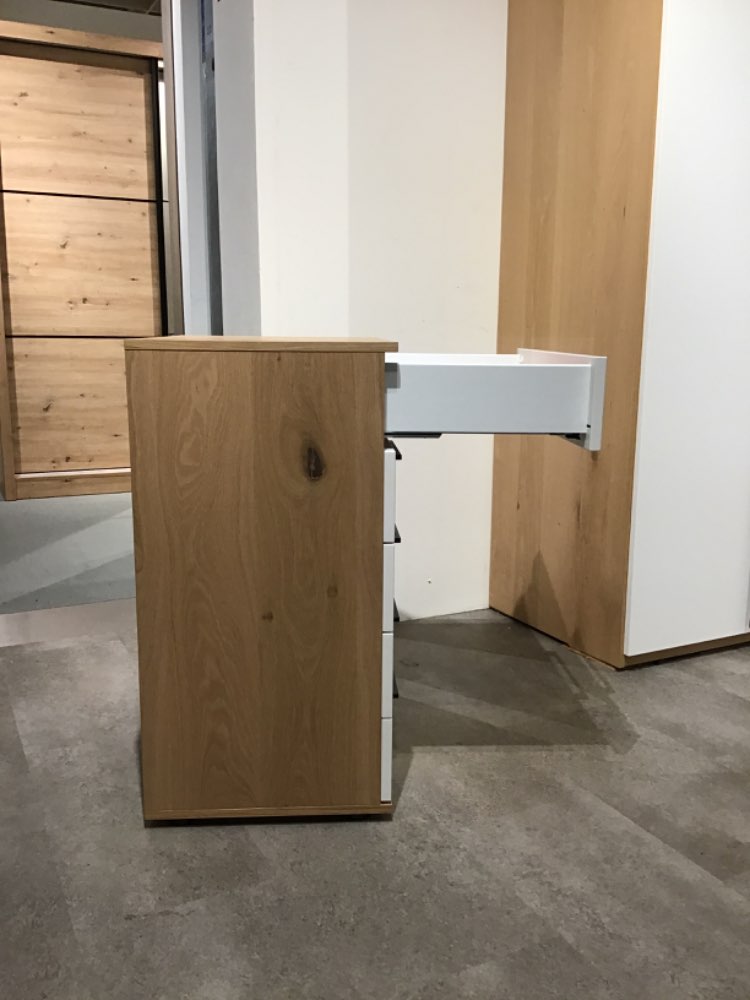 BemerkungDie Schubkasten-Kommode (B/H/T: ca. 60 x 82 x 46 cm) ist mit einem Echtholz-Furnier-Korpus der Art Balkeneiche versehen, während die Schubkasten-Fronten mit einem weißen Echtlack und Vollauszügen versehen sind.