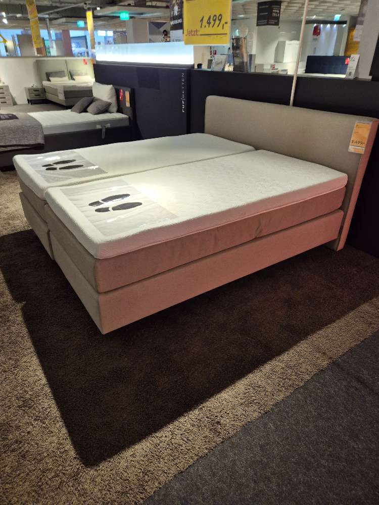 Bemerkung Erleben Sie unvergleichlichen Schlafkomfort mit dem PERFECT CLASSIC Boxspringbett aus dem Hause Schlaraffia, einem einzigartigen Ausstellungsstück, das nicht mehr nachbestellt werden kann. Dieses beeindruckende Bett in 180x200 cm bietet mit seiner Schweboptik und verstärkten 15 cm hohen Füßen nicht nur eine schön anzusehende Leichtigkeit, sondern verleiht Ihrem Schlafzimmer auch eine elegante und moderne Ausstrahlung. Das Kopfteil erhebt sich stolz auf eine Höhe von 103 cm und rundet das stilvolle Design des Bettes perfekt ab. Das wohl durchdachte Schlafzimmer-Highlight bietet zwei hochwertige, geteilte Taschenfederkernmatratzen mit Härtegrad 3 und 4, die optimalen Liegekomfort für unterschiedliche Bedürfnisse gewährleisten. Der zusätzlich enthaltene geteilte GELTEX-Topper, 10 cm hoch, sorgt besonders für die optimale Druckentlastung und minimiert die Bewegungsübertragung des Schlafpartners – ideal für einen ungestörten Schlaf. Der funktionale, unempfindliche beige Stoff ergänzt die praktische Seite des Bettes, sodass es nicht nur hübsch anzusehen, sondern auch pflegeleicht ist. Ein wahrhaft traumhaftes Bett, das schlichtweg begeistert.