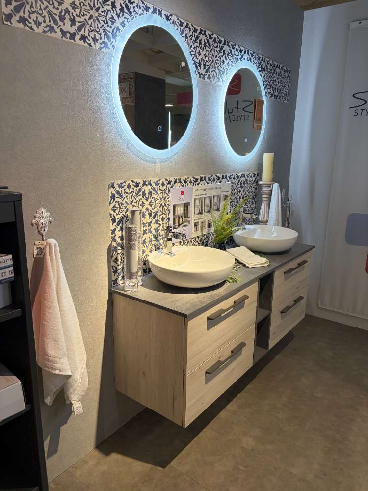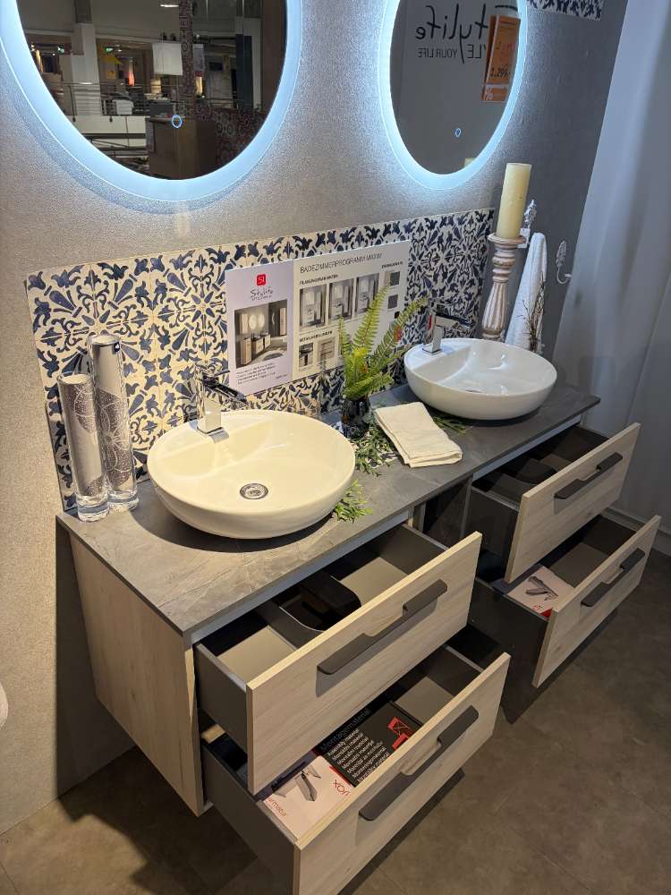 Inklusive sind Chrom-Armaturen, die einen luxuriösen Akzent setzen und sich harmonisch in das Gesamtbild einfügen. Die Softclose Auszüge sorgen für ein leises und schonendes Schließen der Schubladen, was nicht nur Komfort, sondern auch Langlebigkeit verspricht. Die runden Spiegel mit einem Durchmesser von ca. 60 cm runden das Gesamtbild stilvoll ab und verleiht dem Raum zusätzliche Tiefe und Eleganz. Als Ausstellungsware angeboten, bringt dieses Komplettbad ein High-End-Design in jede häusliche Umgebung.