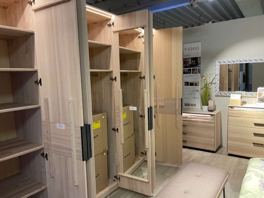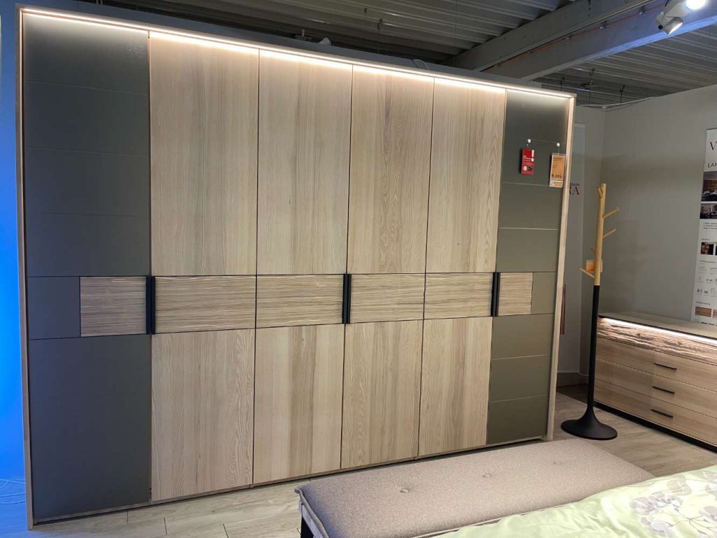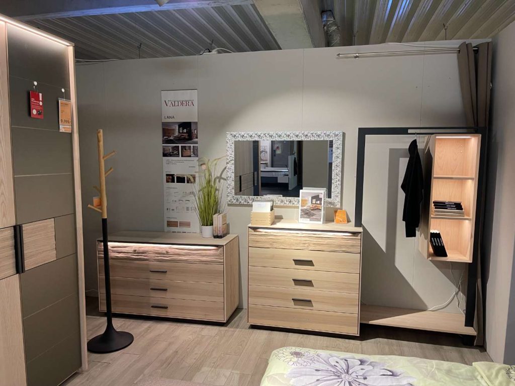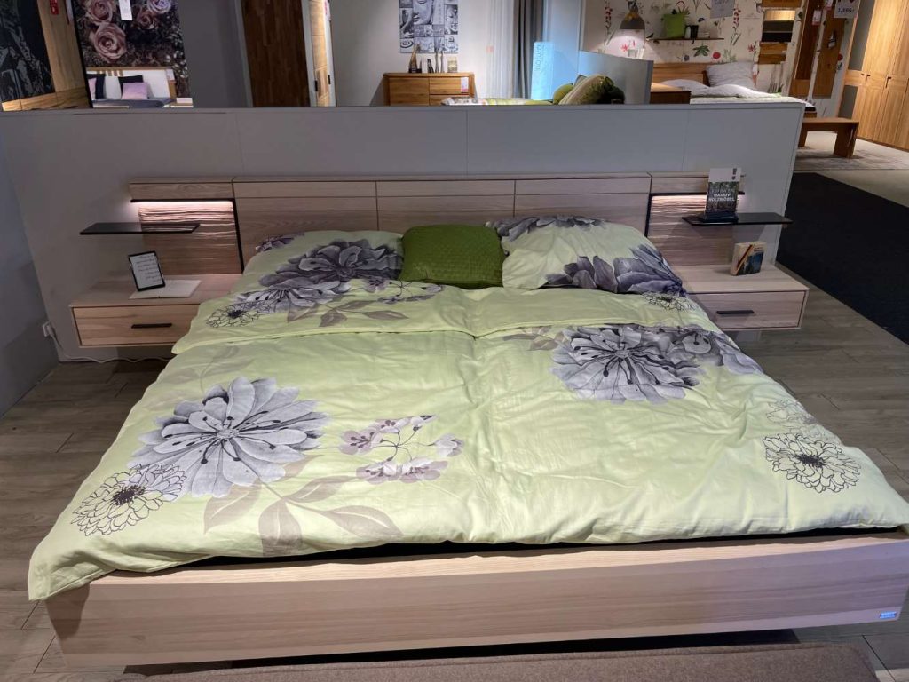 BemerkungDas Modell LANA verspricht ein außergewöhnliches Erlebnis in Ihrem Schlafzimmer. Die Einrichtung in Struktureseche Massiv kombiniert natürliche Eleganz mit funktionalem Design in einer verblüffend attraktiven Ausstellungsware. Die großzügige Bettanlage bietet mit einer Liegefläche von 180x200 cm und praktischen Bettschubkästen reichlich Platz und Stauraum. Die im Lieferumfang enthaltenen Nachttische, ausgestattet mit Paneelen und integrierter Beleuchtung, runden das edle Schlafzimmerbild harmonisch ab.
