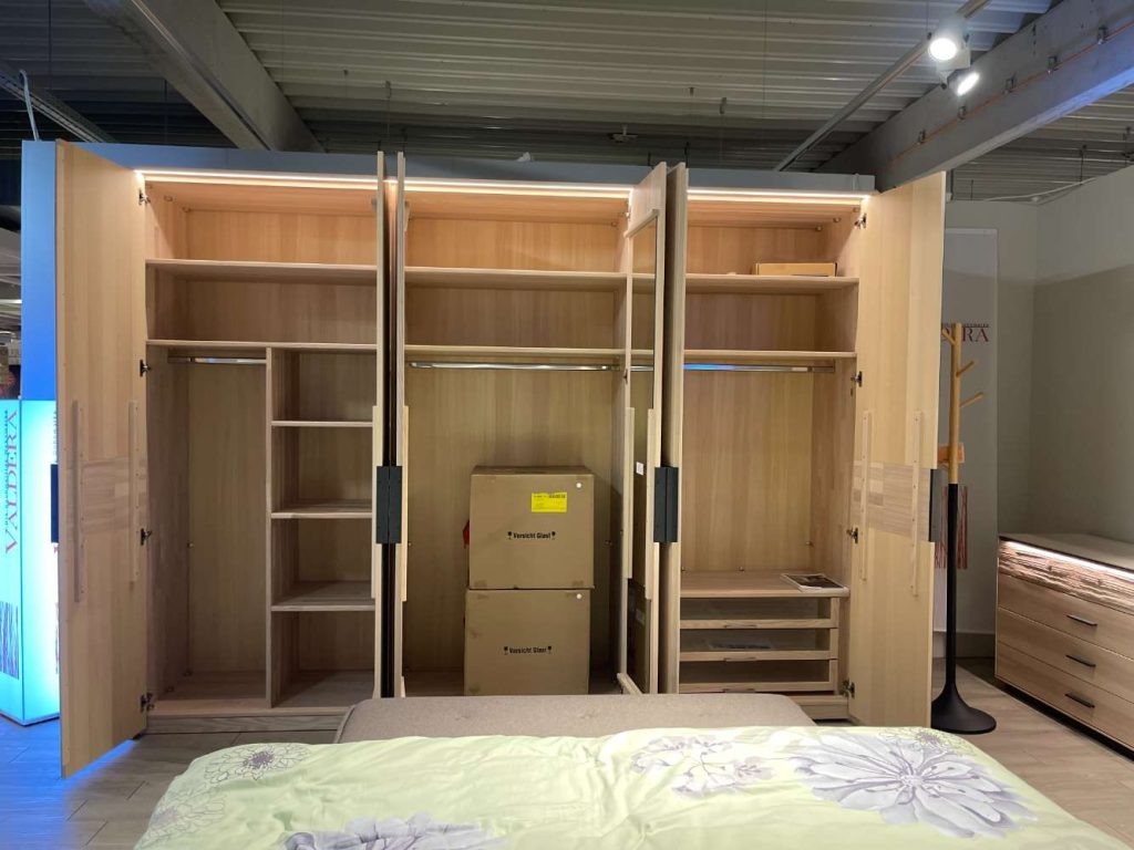 Der dreimeterbreite Kleiderschrank besticht mit einem Passepartoutrahmen und beeindruckender Beleuchtung. Innen begeistert er durch Schubkästen, Einlegeböden und einen Spiegel, die jeden Wunsch nach Ordnung und Übersichtlichkeit erfüllen. Die ebenfalls beleuchtete Kommode mit den Maßen von 127 cm Breite und 76 cm Höhe bietet weiteren Stauraum. Eine Kombination aus Kommode und Garderobe komplettiert das Set, während eine bequem gepolsterte Bettbank, die Entspannung pur verspricht, den Komfort auf ein neues Level hebt. Alle Möbel werden ohne Lattenroste, Matratzen und Dekoration angeboten, was Ihnen die Freiheit lässt, Ihre eigenen Akzente zu setzen.