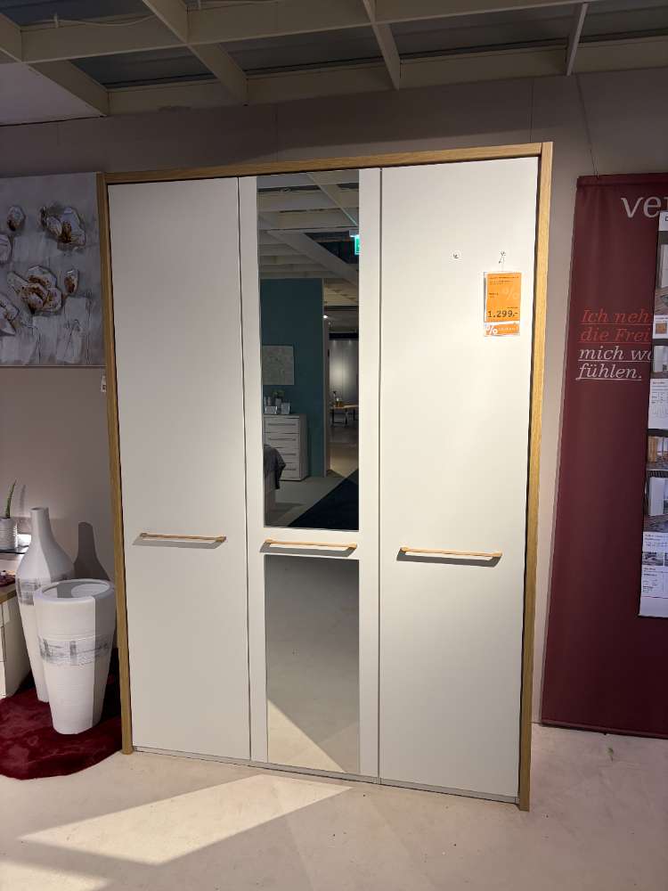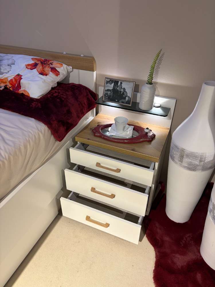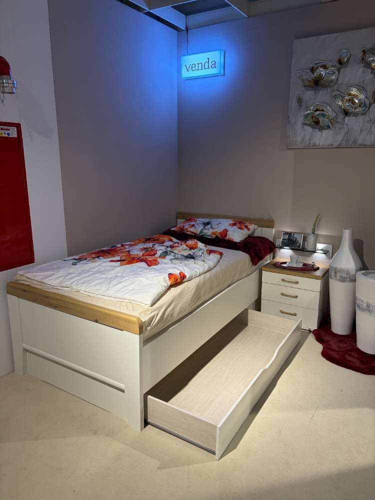 Bemerkung Das Schlafzimmer-Set DAVOS präsentiert sich in einem eleganten und modernen Design, das dank seiner farblichen Kombination aus Weiß und Bianco-Eiche eine einladende und ruhige Atmosphäre schafft. Diese Ausstellungsware, gefertigt aus hochwertigem Dekor, punktet durch umfassende Funktionalität und ansprechende Optik. Das Bett des Sets misst ca. 207/109/88 cm bei einer Liegefläche von 100x200 cm und ist mit einem praktischen Bettschubkasten ausgestattet, der zusätzlichen Stauraum bietet. Der Kleiderschrank beeindruckt mit seinen Abmessungen von ca. 153/216/58 cm und der komfortablen Ausstattung: Ein Spiegel an der Tür vergrößert optisch den Raum, während vier Einlegeböden und zwei Kleiderstangen für genügend Platz zur Organisation der Garderobe sorgen. Abgerundet wird das Set vom Nachtschrank, der mit seinen drei Auszügen und einem stilvollen Paneel ausreichenden Raum für persönliche Gegenstände bereithält. Mit DAVOS bringen Sie raffinierte Eleganz und praktische Ordnung in Ihr Schlafzimmer.