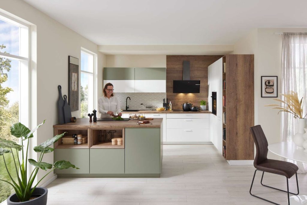 Front in Lack Alpinweiß Premium matt/oliv matt, Korpus in Alpinweiß,