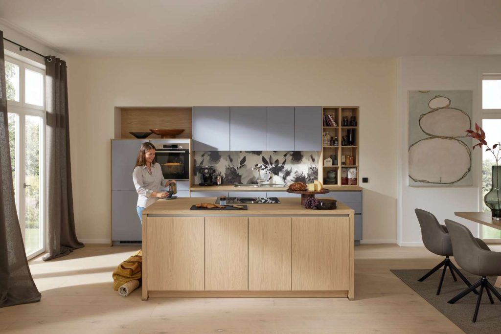 MONDO Einbauküche Front in Lack Sky Premium matt und Eiche Como Nachbildung, Korpus in Steingrau, Arbeitsplatte in Eiche Como Nachbildung. Stellmaß: ca. 397+220 cm. Geschirrspüler und Muldenlüfter nach Wahl gegen Mehrpreis.