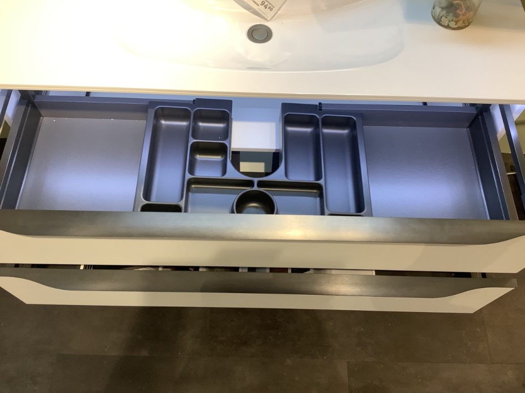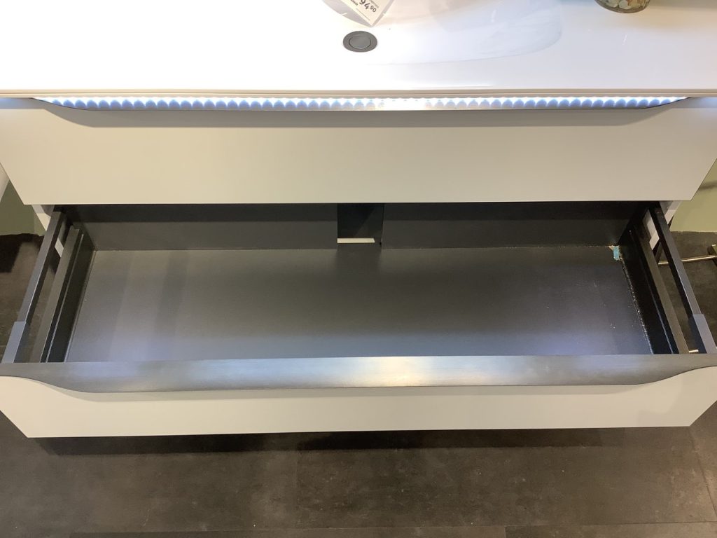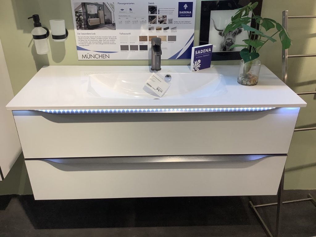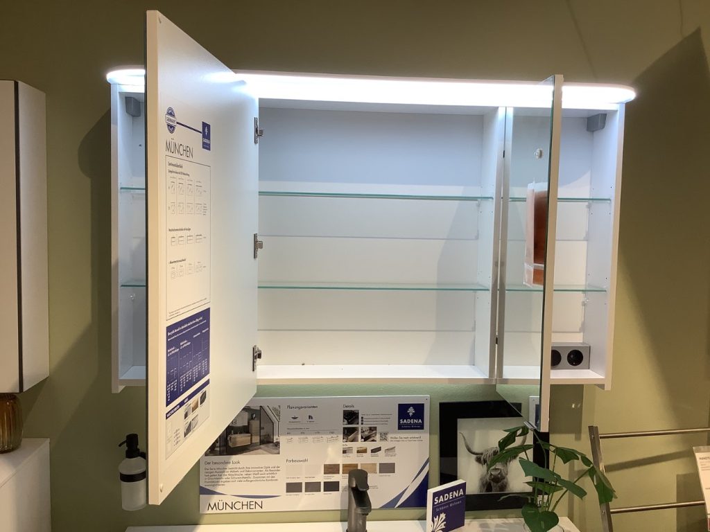 Bemerkung !!!AUSSTELLUNGSWARE!!! !!!SELBSTABBAU!!! Badezimmer bestehend aus: - Waschtischkombie B/H/T ca. 117/49/48 cm Inkl. Mineralgussbecken, Fugenbeleuchtung mit Bewegungssensor und Hnadtuchhalter 2x Schubladen - Spiegelschrank B/H/T ca. 120/72,3/17 cm 3x Tür Inkl. Aufsatzleuchte Inkl. Waschplatzbeleuchtung - Hängeschrank B/H/T ca. 45/70/17 cm - Unterschrank B/H/T ca. 45/73/33 cm