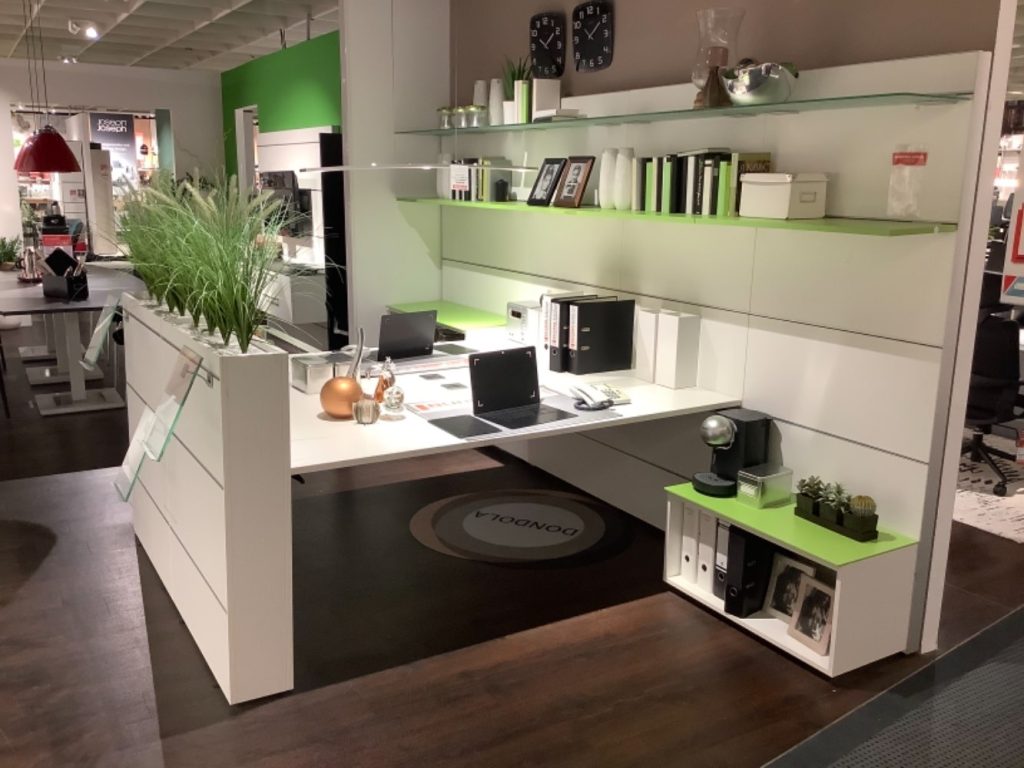 Bemerkung Der Muliwa von KLAIN Büromöbel präsentiert sich als ideale Lösung für ein modernes und funktionales Büro. In stilvollem Weiß und erfrischendem Limonengrün gehalten, besticht diese Ausstellungsware nicht nur durch ihre ansprechende Optik, sondern auch durch ihre durchdachte Konstruktion. Die großzügige Grundstellfläche von etwa 340 x 110 cm bietet ausreichend Platz für kreatives Arbeiten und effiziente Büroorganisation. Zwei funktionale Schreibtische mit den Maßen von jeweils 180 x 72 x 80 cm integrieren sich harmonisch in das Ensemble und bieten viel Raum für Unterlagen, Technik und weitere Arbeitsmaterialien. Die Höhe der Modulwand beträgt ca. 193 cm und sorgt für eine angenehme Abgrenzung und Privatsphäre im Büro. Die Trennwand von etwa 160 x 106 cm schafft zusätzlich Bereiche, die den individuellen Bedürfnissen angepasst werden können. Zubehör, das im Lieferumfang enthalten ist, erleichtert die Organisation und Anpassung des Arbeitsbereichs nach persönlichen Vorlieben. Die durchdachte Gestaltung und die hochwertige Verarbeitung der Muliwa Serie machen sie zu einem zuverlässigen und stilvollen Begleiter in jedem Büro.