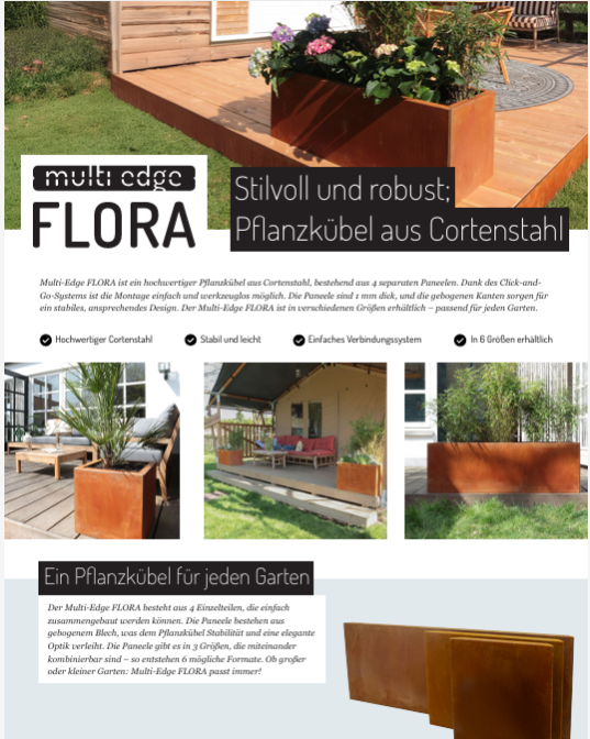 Die Multi-Edge FLORA ist ein eleganter Pflanzkübel aus hochwertigem, pflegeleichtem Cortenstahl. Erhältlich in verschiedenen Größen, fügt er sich mühelos sowohl in kleine Stadtgärten als auch in großzügige Außenbereiche ein. Die unterschiedlichen Formate ermöglichen kreative Kombinationen, die zu jedem Gartendesign passen.