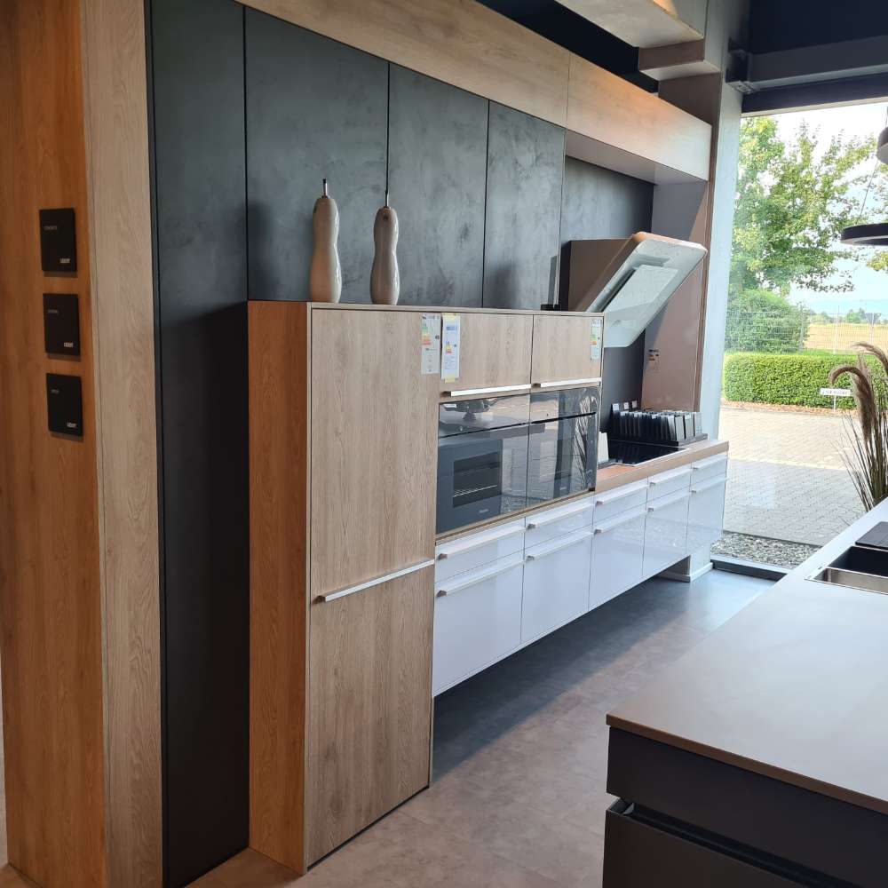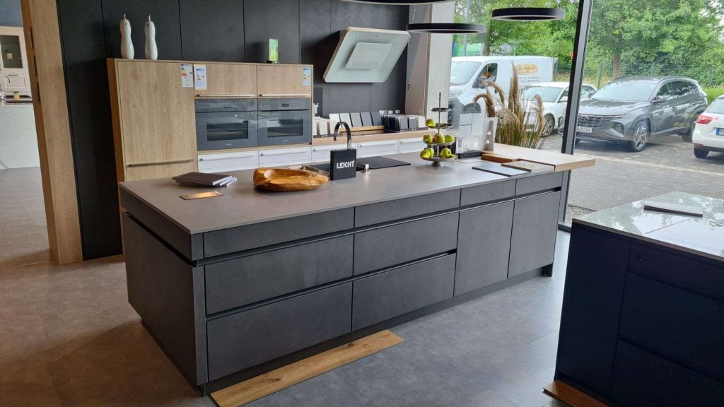 ModellLeicht Echtbeton-Front Modell Concrete in der Farbe Brasilia kombiniert mit der Leicht Hochglanz-Lack-Front Modell Sirius in der Farbe Arktis und Modell Synthia in der Farbe Highlandseiche