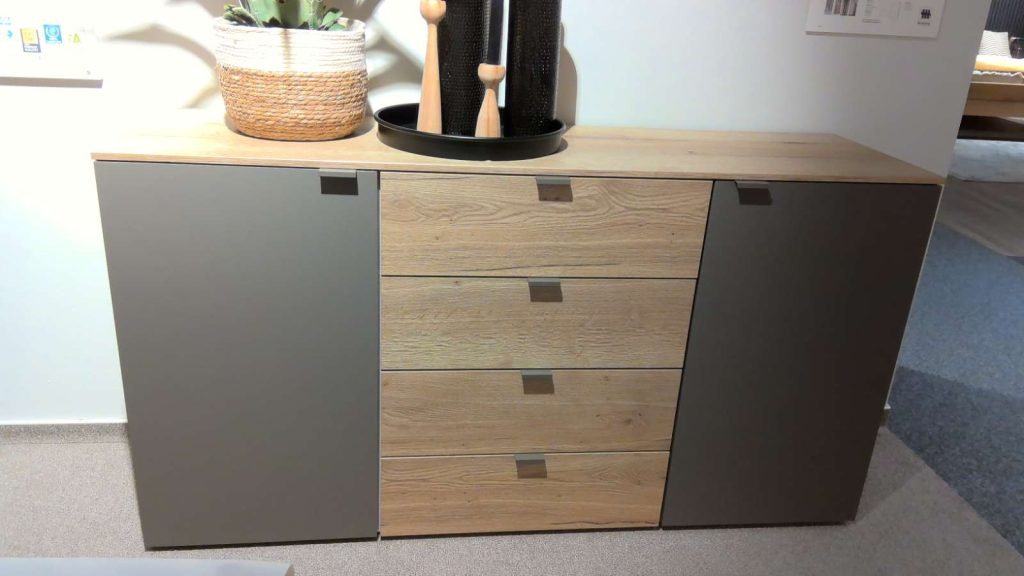 BemerkungDiese Musterring Kommode vereint mühelos Eleganz und Funktionalität. Sie präsentiert sich in einem ansprechenden Terra braun-grau, ergänzt durch das warme und einladende Aussehen von Eiche Silea. Gefertigt aus hochwertigem Holz, strahlt dieses Möbelstück natürliche Schönheit und Langlebigkeit aus. Mit den Maßen von ca. 150x79x42 cm bietet es ausreichend Platz für verschiedenste Anwendungen und fügt sich harmonisch in jede Wohnumgebung ein. Dieses Ausstellungsstück zieht die Blicke auf sich und vereint Stil und Qualität.