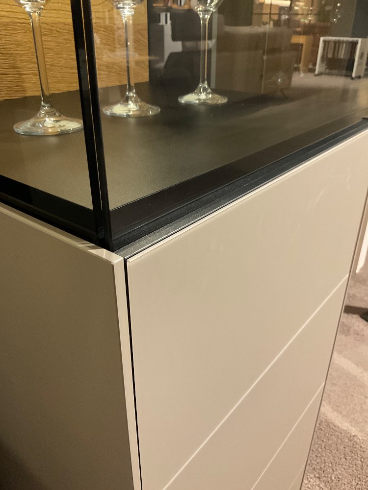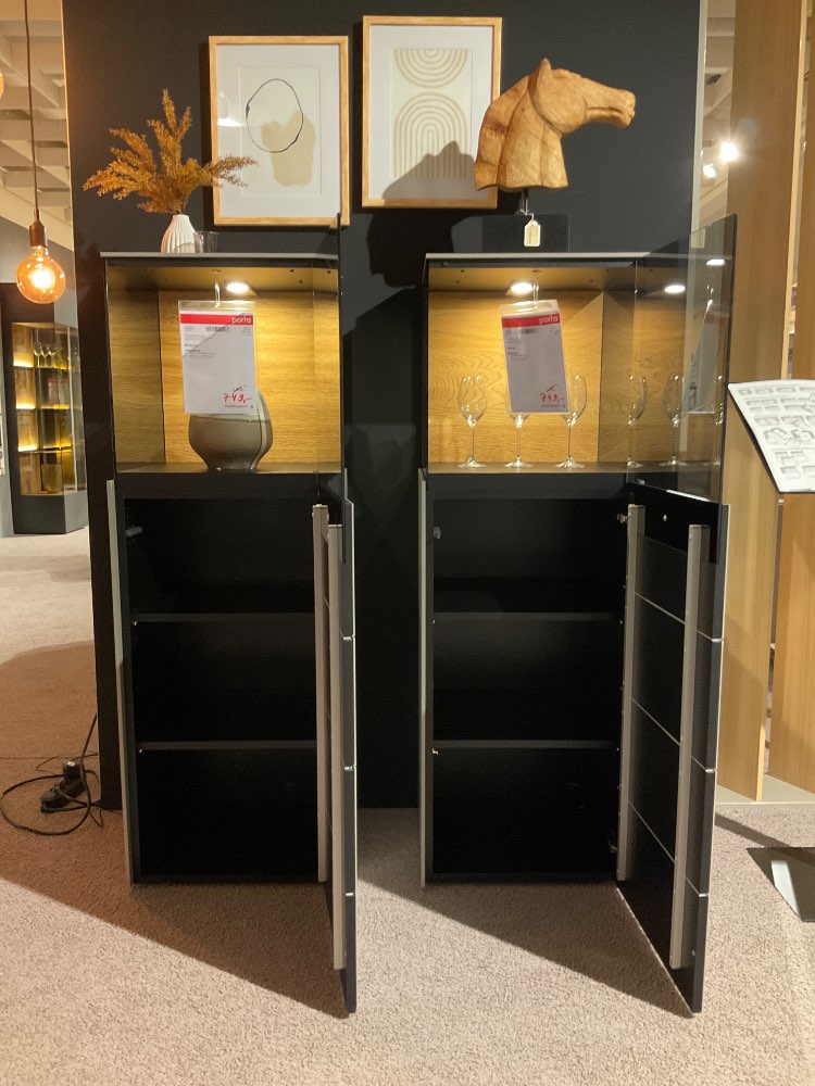 Bemerkung Lack fango/ Front Mattglass Fango, Rückwand Eiche massiv gebürstet. Vitrine Rechtsanschlag/Linksansclag B/H/T ca. 47/137/42 cm. Da Ausstellungsstück sind leichte Gebrauchsspuren möglich. Die Ware können in Gütersloh bei Porta besichtigt werden.