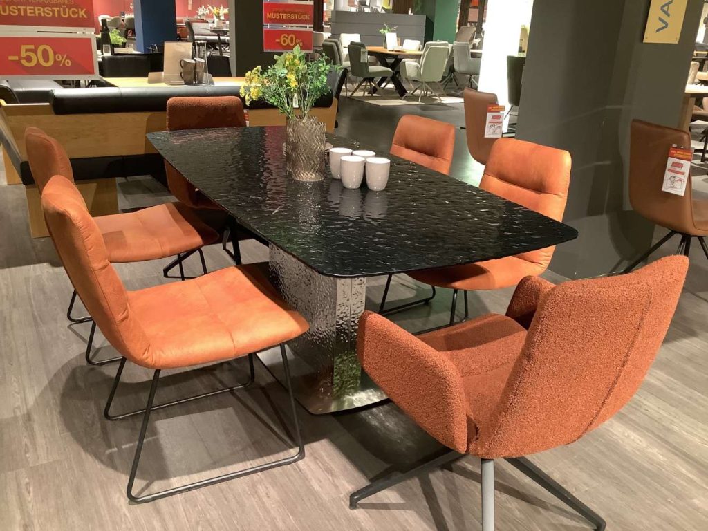 Bemerkung4 x Stuhl Bezug : Savanna Rusty PG6,Kufengestell Metall Schwarz Matt 990 und 2 x Armlehnstuhl Bezug : Stoff Loop Rusty PG8,Spinnenfuß Schwarz Matt ,drehbar