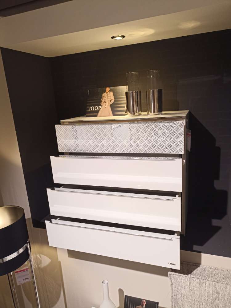 Bemerkung 1x Kommode (B/H/T ca. 80/77/40 cm) Korpus Dekor weiß, Front Alpinweißglas Griff und Zierleisten chromfarbig darin enthalten: 4x Schubkasten teilverglast