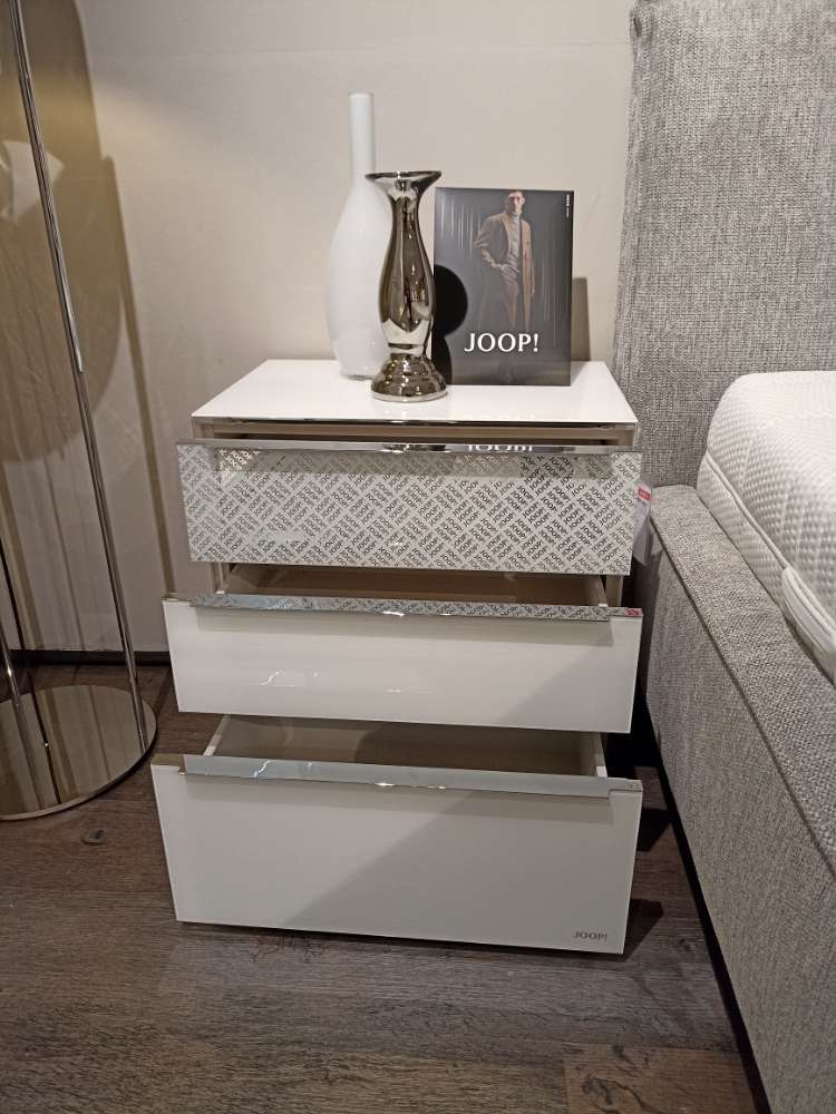 1x Nachtkonsole (B/H/T ca. 58/63/40 cm) Korpus Dekor weiß, Front Alpinweißglas Griff und Zierleisten chromfarbig darin enthalten: 3x Schubkasten teilverglast