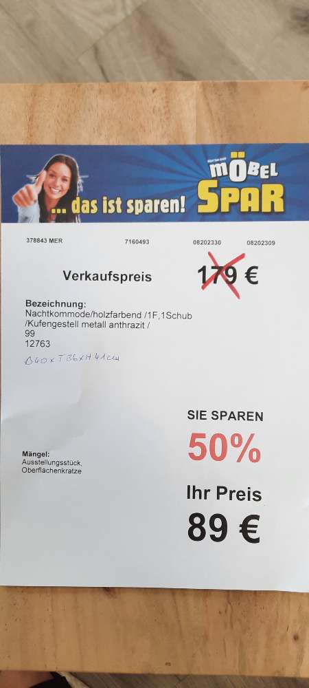 BemerkungHierbei handelt es sich um ein Angebot von Möbel Spar Standort des Artikels ist Merseburg Details wie technische Daten (Maße etc.) oder Schäden entnehmen Sie dem Bild mit Preis. RESERVIERUNG: Bei einem längeren Anfahrtsweg und vorheriger Absprache mit der Verkäuferin vor Ort ist eine Reservierung, für die Dauer der Fahrt maximal jedoch für 4 Stunden möglich. Von Sonderanfragen bitten wir abzusehen. VERSAND: Grundsätzlich bieten wir keinen Versand unserer Artikel an. Aufgrund von meist vorhandenen kleineren bis größeren Mängeln, ist ein Fernabsatzgeschäft nicht möglich. Da der Kunde die Mängel selbst vor Ort und Kauf sehen und dafür unterschreiben muss. Bei Kleinartikeln im Deko Bereich oder Restpostenbereich besteht ggf. die Möglichkeit fragen Sie uns hierzu einfach an. TRANSPORT: Wir selbst bieten keine direkten Zufuhren / Lieferungen an, haben aber in jeder Filiale Minimum einen externen Anbieter der dies für uns übernimmt. Die Kontaktdaten geben wir bei Interesse gerne weiter. Aus Haftungsgründen ist dies ein Fremdgeschäft und wird zwischen dem Kunden und dem Transportunternehmen getroffen und ist unabhängig von der Möbel Spar GmbH. UMLAGERUNG: Sie haben einen Artikel entdeckt welcher in einer anderen Filiale als Ihre nächstgelegene lagert? Kein Problem, wir bieten eine interne Umlagerung an. In diesem Fall muss der Kunde eine Anzahlung in dem Abholmarkt tätigen. Je nach Größe und Aufwand kann eine individuelle Transfergebühr berechnet werden. Der Kauf ist keine Pflicht, es wird aber bei Nichtgefallen und Wegfall des Verkaufes eine pauschale Bearbeitungsgebühr in Höhe von 15€ einbehalten, ebenso die ggf. angefallene Transfergebühr. WICHTIG: Bitte telefonisch erfragen ob der Wunschartikel noch verfügbar ist. Zwischenverkauf vorbehalten. Die Besichtigung, der Verkauf und die Abholung erfolgt ausschließlich bei unserem Handelspartner: MÖBEL SPAR GmbH ,06217 Merseburg, Einfahrt über Geusaer Str.15 Ihre Ansprechpartnerin Frau Pfeiff erreichen Sie telefonisch unter 017657890762 oder 034612756990
