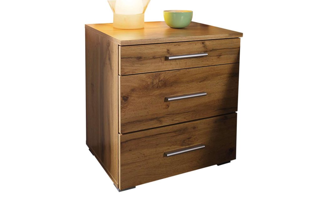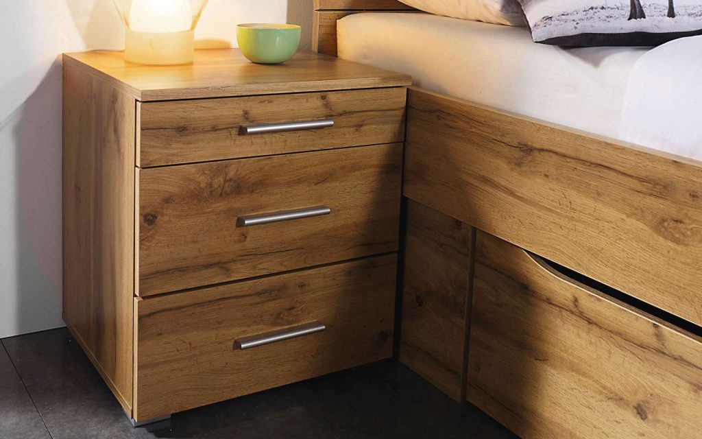 Nachttischpaar mit einem Korpus in Wotan Eiche-Nachbildung, 3 Schubkästen, B/H/T ca. 47 x 52 x 42 cm je Nachttisch.