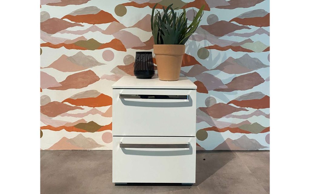 BemerkungKorpus und Front in alpinweiß matt, inklusive breite Griffe in Chrom Dekor, 2 Schubkästen mit Selbsteinzug, Unterflurschiene und Dämpfer, B/H/T ca. 40 x 49 x 42 cm