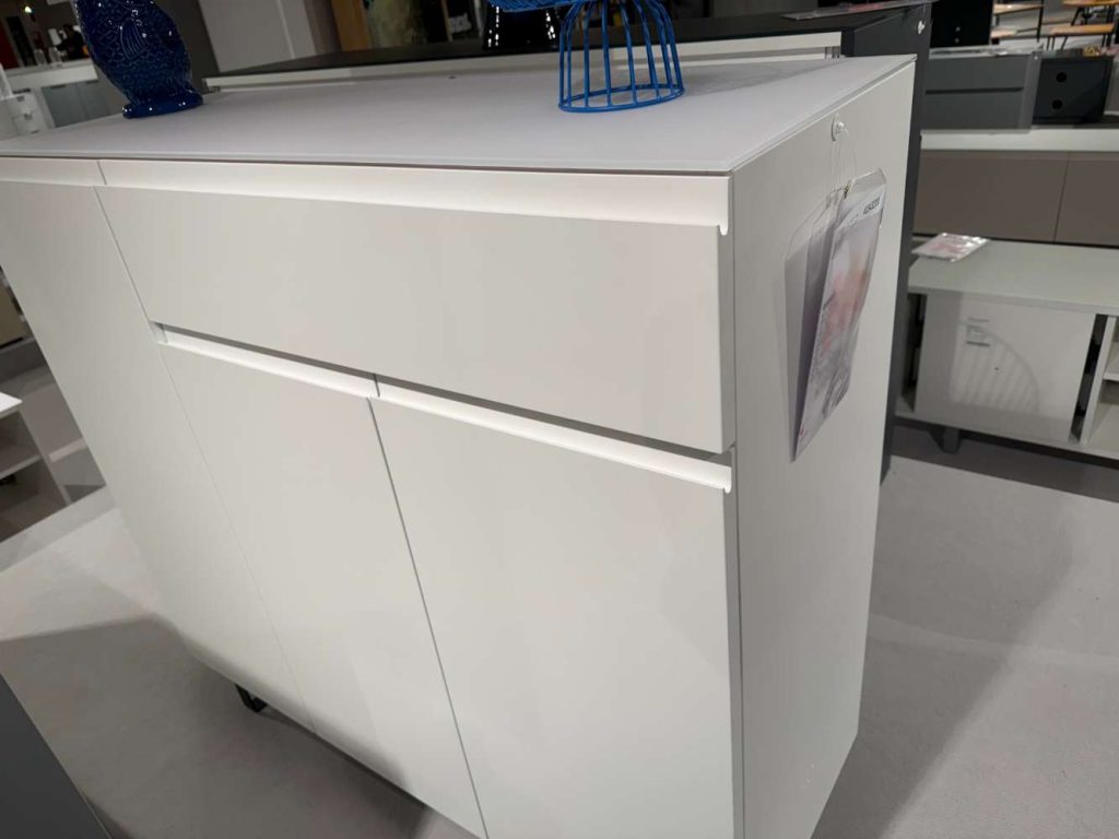 BemerkungDie Nicolo Kommode in strahlendem Weiß matt ist ein elegantes Möbelstück, das sich nahtlos in jede Inneneinrichtung integrieren lässt. Gefertigt aus hochwertigem Holz und mit einer eleganten, mattweißen Furnier-Oberfläche versehen, strahlt sie eine zeitlose Ästhetik aus und verleiht jedem Raum einen Hauch von Raffinesse. Mit den Maßen von ca. 120 cm in der Breite, 110 cm in der Höhe und 45 cm in der Tiefe bietet sie ausreichend Stauraum für diverse Gegenstände, ob im Wohn-, Schlaf- oder Esszimmer. Diese Kommode ist eine Ausstellungsware, die durch ihre schlichte Eleganz und Funktionalität besticht. Ihre großzügige Ablagefläche eignet sich ideal, um dekorative Gegenstände stilvoll in Szene zu setzen. Die hochwertigen Materialien und die sorgfältige Verarbeitung garantieren eine langlebige Nutzung, während das minimalistische Design für eine moderne Wohnatmosphäre sorgt.