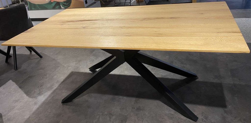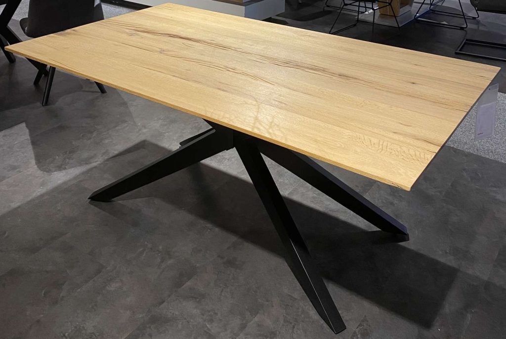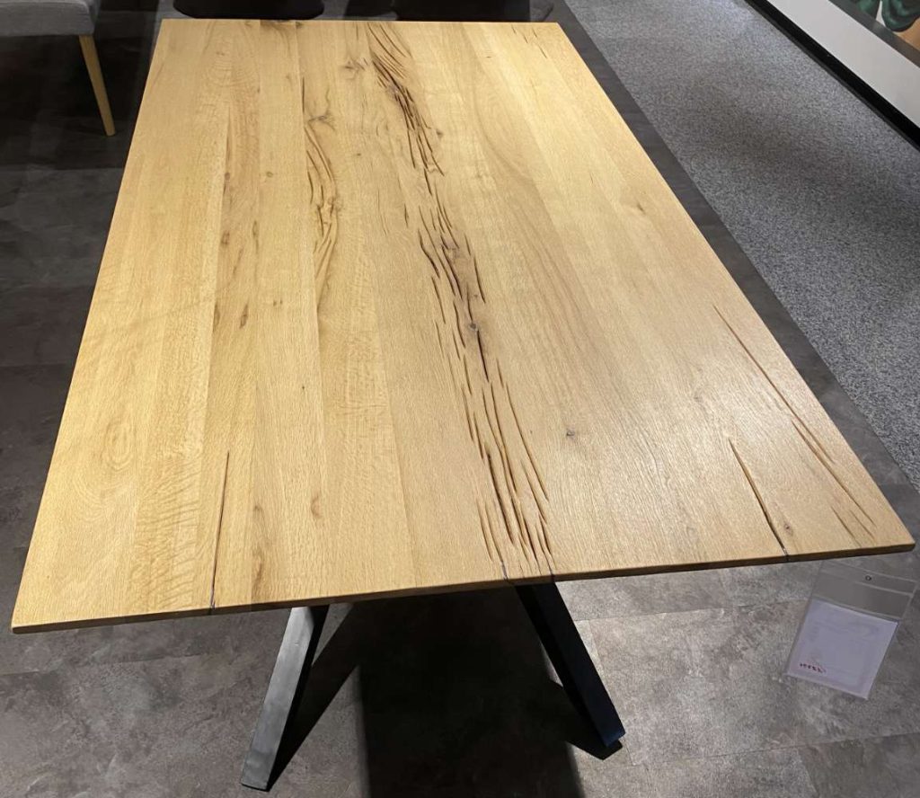BemerkungDer Tisch Windhock von NIEHOFF besticht durch seine eindrucksvolle Kombination aus natürlicher Balkeneiche und einem stabilen schwarzen Metallgestell. Diese ästhetische Verbindung vereint die warme Ausstrahlung des massiven Eichenholzes mit der modernen Eleganz des Metallrahmens und schafft so einen einzigartigen Blickfang in jedem Raum. Mit einer großzügigen Tischfläche von ca. 180x100 cm bietet der Tisch ausreichend Platz für gesellige Runden oder ausgiebige Dinner. Als Ausstellungsstück präsentiert er sich in bester Verfassung und zeigt die exquisite Handwerkskunst, die in jedem Detail spürbar ist. Die Natürlichkeit des Holzes wird durch die fein herausgearbeiteten Maserungen unterstrichen, die dem Tisch seinen unverwechselbaren Charakter verleihen. Perfekt für Wohnbereiche, die Wert auf Qualität und Design legen, vereint der Tisch Windhock zeitlose Eleganz mit robuster Funktionalität.