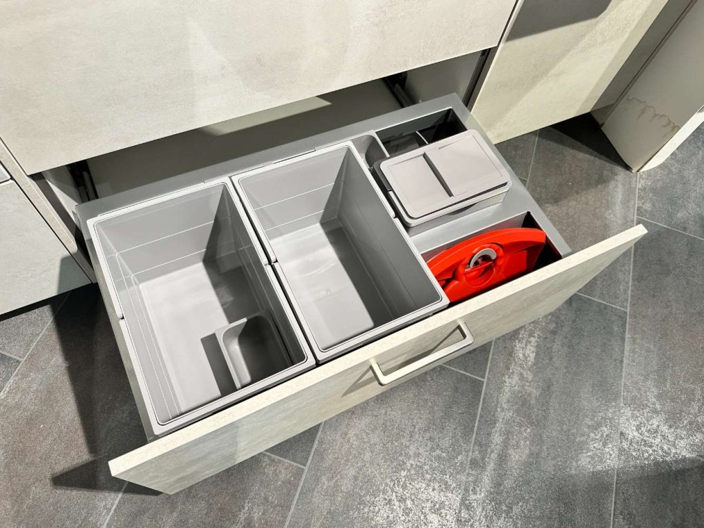 Die Fronten sind neutral in Weißbeton-Nachbildung gehalten, der Korpus in schiefergrau. Dazu passend sind die Metallgriffe edelstahlfarbig.