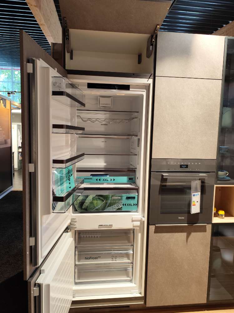 Miele Geräte, XXL Kühl-Gefrier-Kombi von Siemens,Regal mit Glasbodenbeleuchtung, Vitrine mit Beleuchtung, Vorratsschrank mit Auszügen, sehr viel Stauraum, Mülltrennung, Einbauspüle Sysemceram Lava, Armatur von Blanco Edelstahl