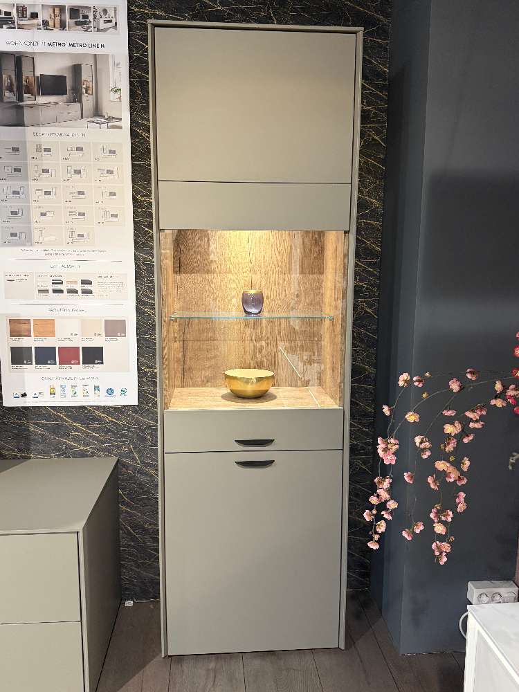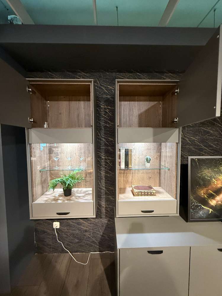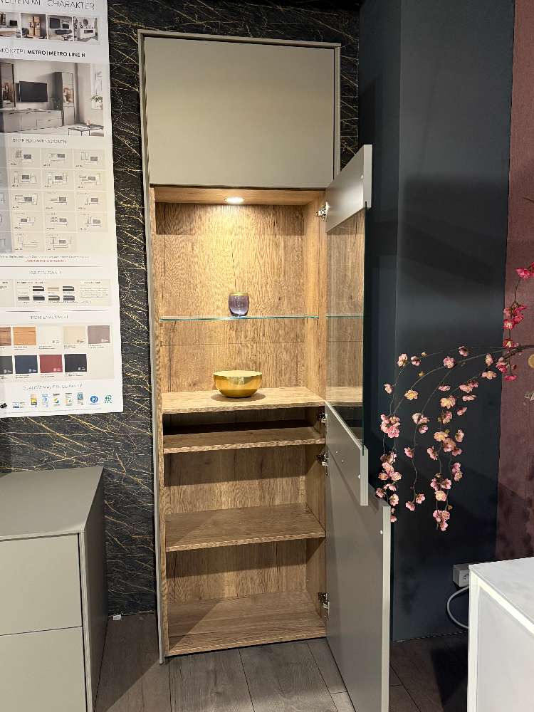 Lacklaminat Taupegrau ultramatt, Rückwand und Innenkorpus Eiche Havanna