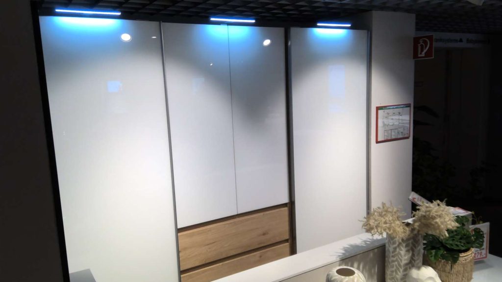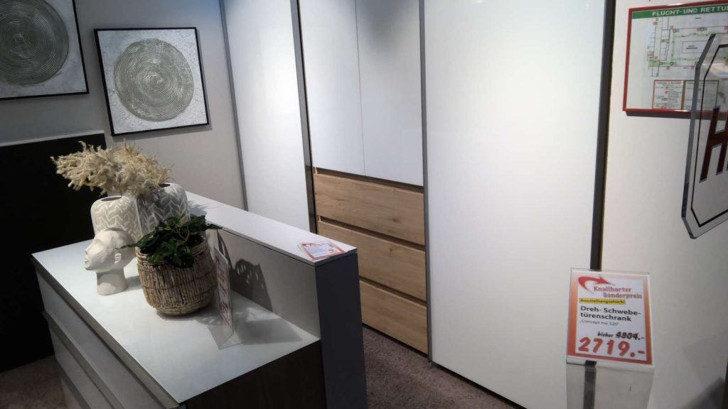 Bemerkung Der Schwebetürenschrank/Drehtürenschrank "Concept me 320" von NOLTE MÖBEL ist ein eindrucksvolles Möbelstück, das sowohl in Funktion als auch in Ästhetik überzeugt. Mit einer Breite von ca. 260 cm, einer Höhe von etwa 223 cm und einer Tiefe von ca. 69 cm bietet dieser Schrank großzügigen Stauraum und macht ihn zur idealen Wahl für jedes Schlafzimmer. Die moderne Kombination aus einer Weißglas-Front und einem Korpus sowie Schubkästen in Jackson-Eiche Nachbildung verleiht dem Schrank ein elegantes und zugleich warmes Aussehen. Besonders hervorzuheben ist die integrierte Beleuchtung, die nicht nur die Funktionalität erhöht, sondern auch für eine stimmungsvolle Atmosphäre sorgt. Perfekt für alle, die ein stilvolles und praktisches Möbelstück suchen, das ihre Einrichtung bereichert.