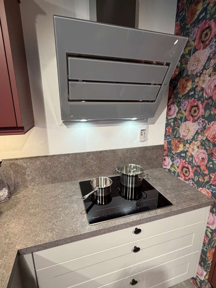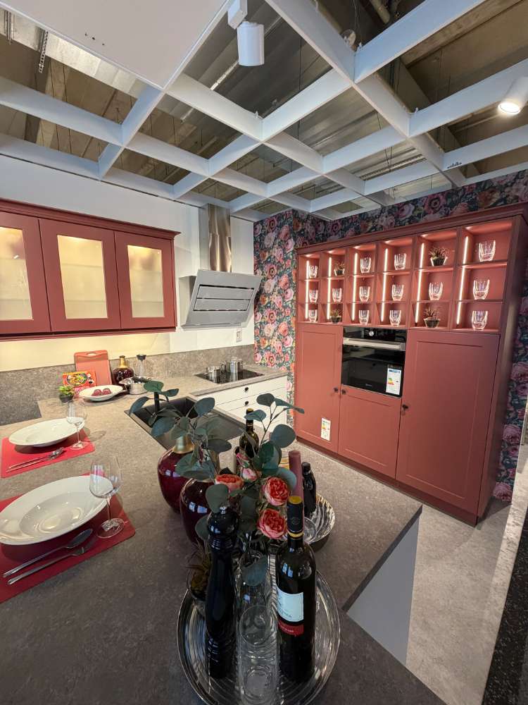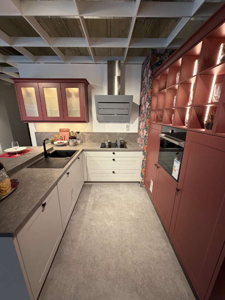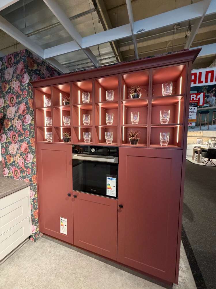 Bemerkung Einbauküche FrameLack/54-83 Front1: Platingrau softmatt Front2: Hennarot softmatt Korpus: Platingrau APL: Naturstein Anthrazit Griff: Knopf schwarz