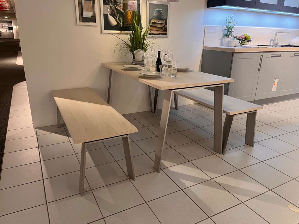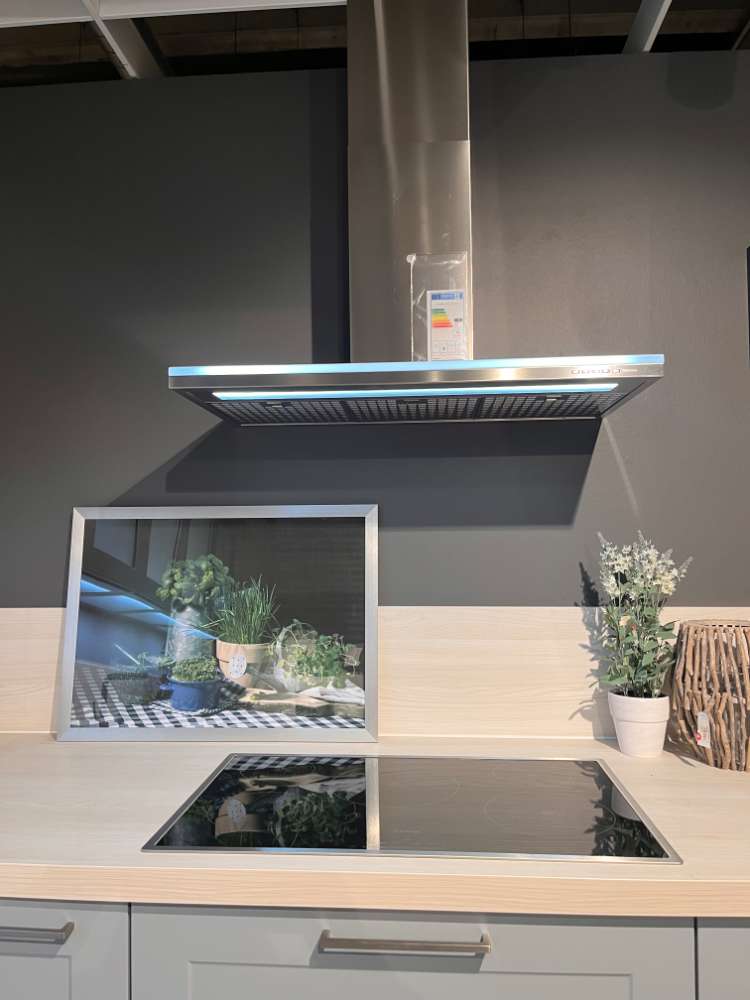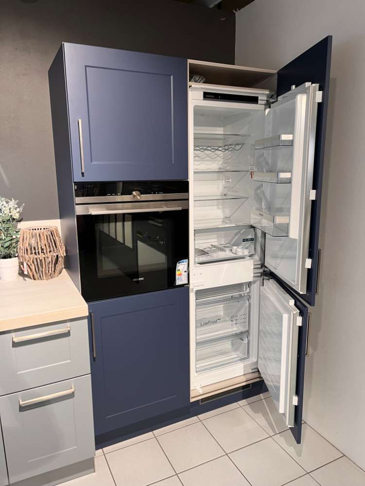 Bemerkung Front: Papyrosgrau/Blaubeere Korpus: Weiß Griff: Relinggriff Edel.-Optik Apl: Nordic Oak inkl. Siemens Geräte inkl. Falmec Haube inkl. Blanco Spüle und Armatur *** ohne Stühle ***
