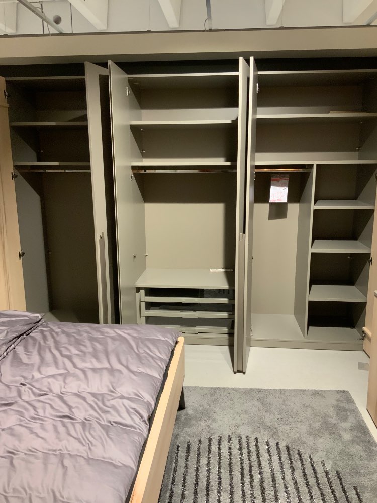 Kleiderschrank ca. 300/222/62 cm, incl.Innenzubehör, Bettanlage incl. Hängekonsolen Liegefläche 180/200 cm, LED Beleuchtung am Konsolenpaneel mit Sensorschalter, 1 Kommode ca. 154/50/45 cm, ohne Rahmen und Matratzen, Ausf. Lack Fango/Kristallbuche Massiv