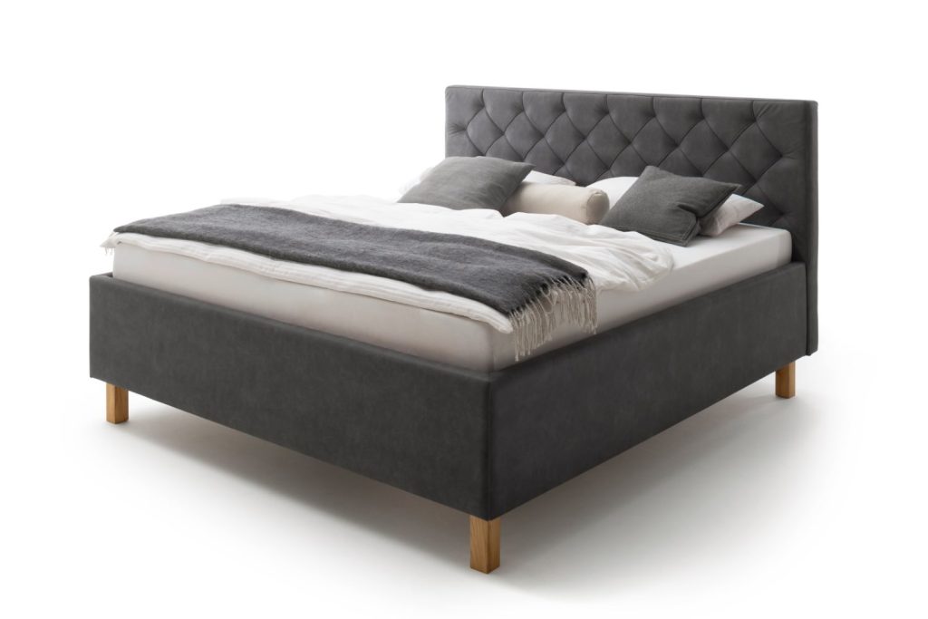Polsterbett Liegefläche ca. 180x200 cm, im Stoff Bulus anthrazit, inkl. Lattenrost und Bettkasten, Fuß in Holz Eiche hell. Ohne Matratze und Dekoration.