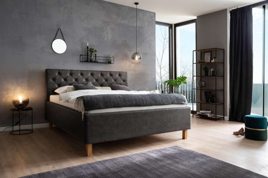 Polsterbett Liegefläche ca. 180x200 cm, im Stoff Bulus anthrazit, inkl. Lattenrost, und Bettkasten, Fuß in Holz Eiche hell. Ohne Matratze und Dekoration.