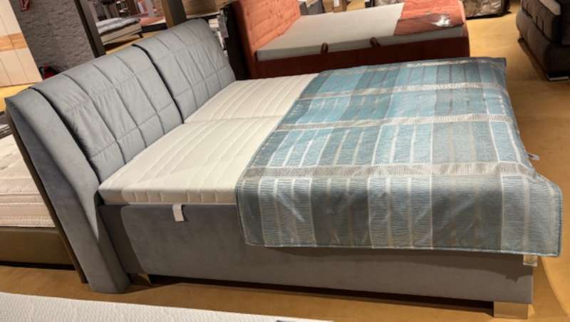 Bemerkung Dieses elegante Polsterbett in einem dezenten Hellblau präsentiert sich als eindrucksvolles Möbelstück, das Komfort und Funktionalität vereint. Es bietet nicht nur eine ansprechende Optik, sondern auch einen gut durchdachten Stauraum mit Belüftung, der Ordnung im Schlafzimmer schafft. Die zwei Lattenrahmen unterstützen die Tonnentaschenfederkern-Matratzen, mit den Härtegraden H2 und H3. Abgerundet wird das Set durch ein stilvolles Plaid, das dem Bett zusätzlich Raffinesse verleiht. Die 10cm hohen Metallfüße in Chrom-Optik sorgen für stabilen Halt und lassen das Bett förmlich über dem Boden schweben, was eine leichte Reinigung darunter ermöglicht.