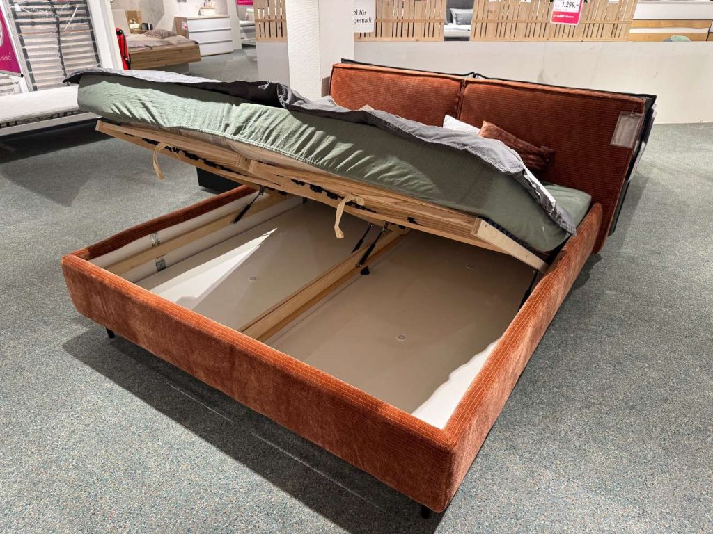 Inklusiv 2 Lattenröste (je 90x200 cm) mit Kopfteilverstellung. Das Fußteil kann mittels Gasdruckfeder geöffnet werden um den Stauraum im Bettkasten bequem zu erreichen.