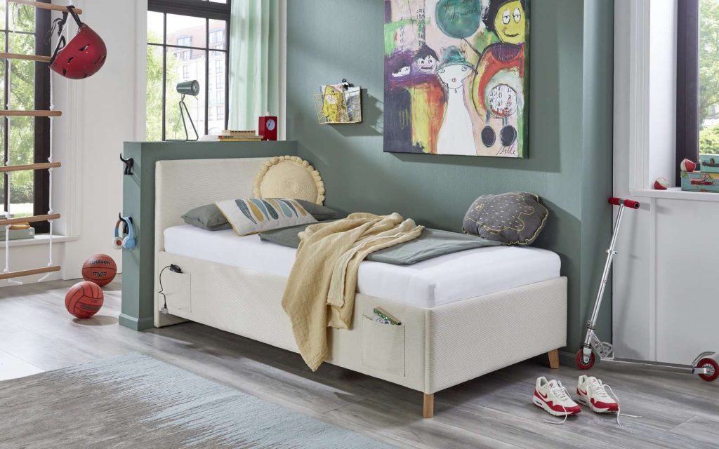 BemerkungPolsterbett in beige, mit seitlich aufklappbaren Ferderleistenrahmen um den Bettkasten zu öffnen, Federleistenrahmen starr mit 28 Federleisten, 5-fach Härtegradverstellung mit Mittelgurt und innenliegenden Kappen, 2 Betttaschen und 2 USB Anschlüssen an einer Betttasche. Oberkante Bettseite ca. 42 cm, Stellmaß B/H/T 96 x 90 x 208 cm, Liegefläche 90 x 200 cm.