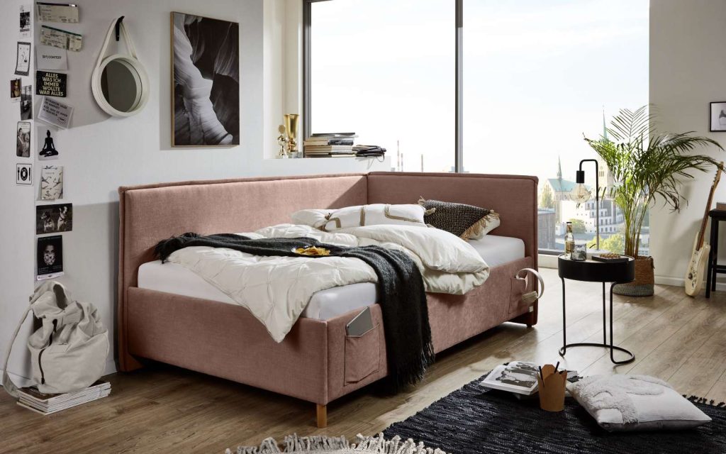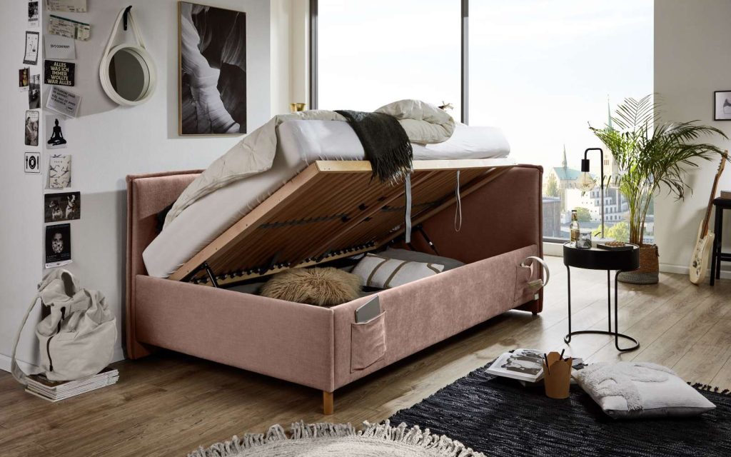 BemerkungPolsterbett in rosa, Kopfteil glatt mit umlaufendem Bliese (Keder), mit Bettkasten, Lattenrahmen mit 28 Federleisten, starr, mit 5-facher Härtegradverstellung und seitlich klappbar, 2 Betttaschen und 2 USB Anschlüssen an einer Betttasche, Oberkante Bettseite ca. 42 cm, Stellmaß B/H/T 146 x 90 x 208 cm, Liegefläche 140 x 200 cm.