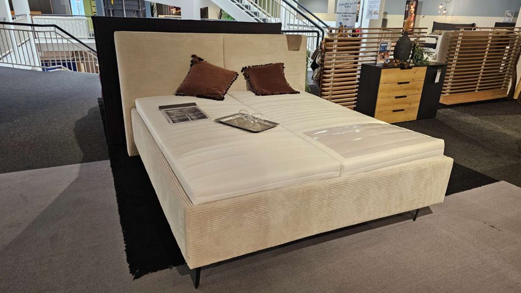 Das Polsterbett 497361-0251 von MEISE bietet eine stilvolle Kombination aus Komfort und Eleganz für Ihr Schlafzimmer. Die exklusive Ausstellungsware besticht durch ihren Bezug aus hochwertigem Stoff POSO in einem dezenten Beige-Ton. Dieser Farbton verleiht dem Bett eine zeitlose Ästhetik, die sich mühelos in verschiedene Einrichtungsstile einfügt. Das Bett zeichnet sich durch ein glattes Kopfteil mit einer stilvollen Mittelnaht aus, die dem Design eine zusätzliche Raffinesse verleiht.